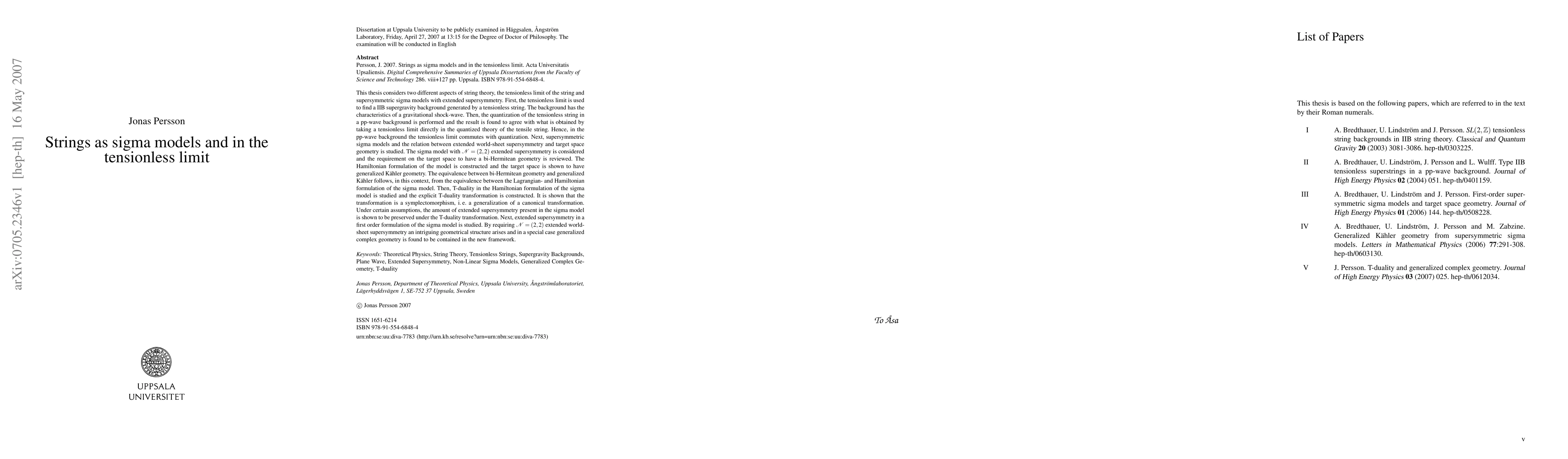 The research explores the tensionless limit of string theory and supersymmetric sigma models, utilizing quantization in pp-wave backgrounds and examining bi-Hermitean geometry and generalized Kahler structures.