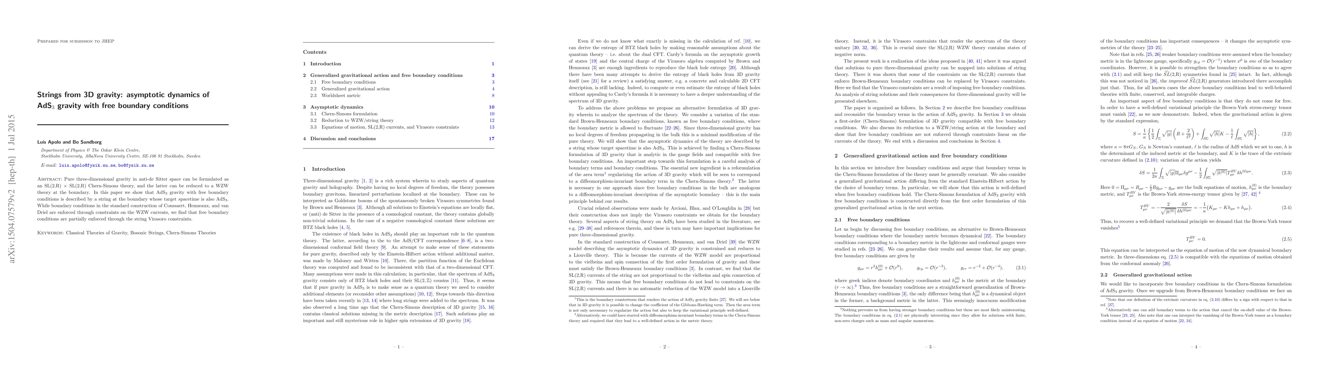 Pure three-dimensional gravity in anti-de Sitter space can be formulated as an SL(2,R) $\times $ SL(2,R) Chern-Simons theory, and the latter can be reduced to a WZW theory at the boundary. In this paper we show that AdS$_3$ gravity with free boundary conditions is described by a string at the boundary whose target spacetime is also AdS$_3$. While boundary conditions in the standard construction of Coussaert, Henneaux, and van Driel are enforced through constraints on the WZW currents, we find that free boundary conditions are partially enforced through the string Virasoro constraints.