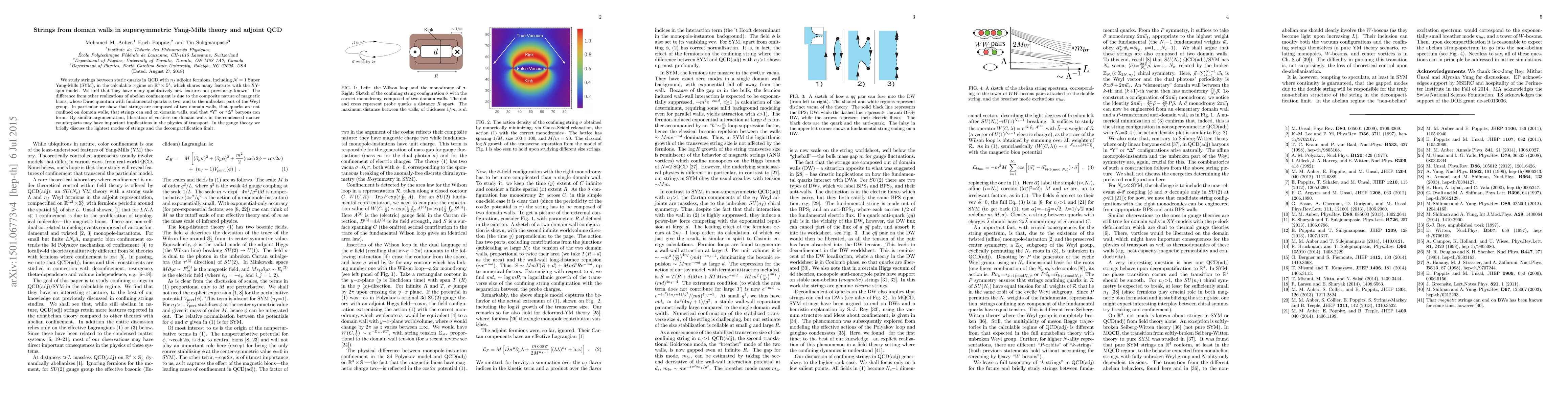 Summary: This paper investigates strings between static quarks in supersymmetric Yang-Mills theory and adjoint QCD, revealing novel features such as strings composed of two domain walls, quarks not confined on these walls, and the formation of "Y" or "$\Delta$" baryons, with a focus on their properties in the $\mathbb{R}^3\times \mathbb{S}^1$ regime.
