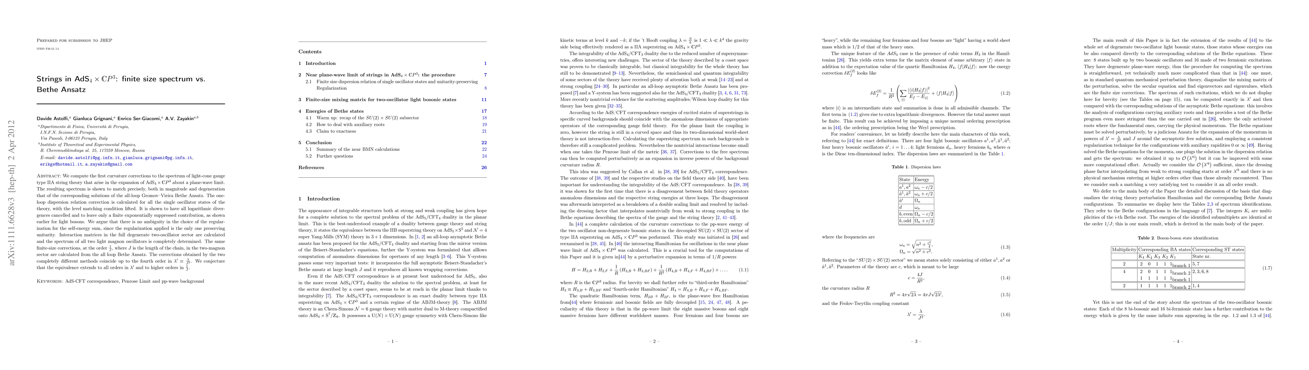 We compute the first curvature corrections to the spectrum of light-cone gauge type IIA string theory that arise in the expansion of $AdS_4\times \mathbb{CP}^3$ about a plane-wave limit. The resulting spectrum is shown to match precisely, both in magnitude and degeneration that of the corresponding solutions of the all-loop Gromov--Vieira Bethe Ansatz. The one-loop dispersion relation correction is calculated for all the single oscillator states of the theory, with the level matching condition lifted. It is shown to have all logarithmic divergences cancelled and to leave only a finite exponentially suppressed contribution, as shown earlier for light bosons. We argue that there is no ambiguity in the choice of the regularization for the self-energy sum, since the regularization applied is the only one preserving unitarity. Interaction matrices in the full degenerate two-oscillator sector are calculated and the spectrum of all two light magnon oscillators is completely determined. The same finite-size corrections, at the order 1/J, where $J$ is the length of the chain, in the two-magnon sector are calculated from the all loop Bethe Ansatz. The corrections obtained by the two completely different methods coincide up to the fourth order in $\lambda' =\lambda/J^2$. We conjecture that the equivalence extends to all orders in $\lambda$ and to higher orders in 1/J.