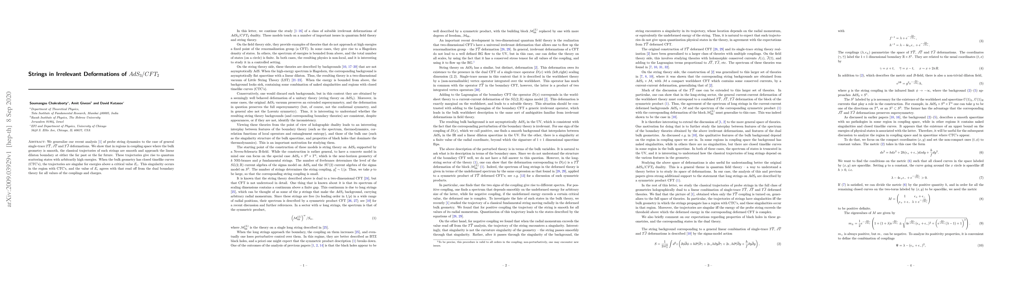 We generalize our recent analysis [2006.13249] of probe string dynamics to the case of general single-trace $T\bar T$, $J\bar T$ and $T\bar J$ deformations. We show that in regions in coupling space where the bulk geometry is smooth, the classical trajectories of such strings are smooth and approach the linear dilaton boundary at either the far past or the far future. These trajectories give rise to quantum scattering states with arbitrarily high energies. When the bulk geometry has closed timelike curves (CTC's), the trajectories are singular for energies above a critical value $E_c$. This singularity occurs in the region with CTC's, and the value of $E_c$ agrees with that read off from the dual boundary theory for all values of the couplings and charges.