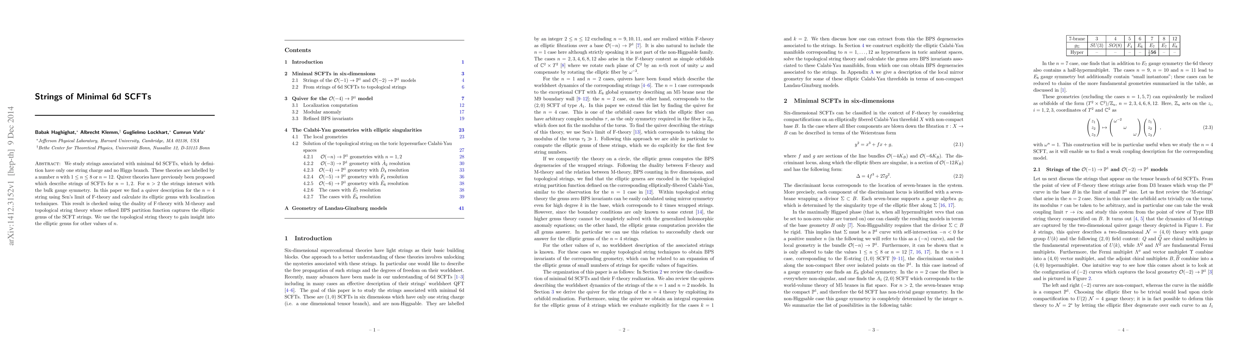 This paper explores the strings in minimal 6d SCFTs with a single string charge, finding a quiver description for n=4 strings via Sen's F-theory limit and calculating their elliptic genus using localization techniques. The results are validated through F-theory's M-theory duality and refined BPS partition functions from topological string theory.
