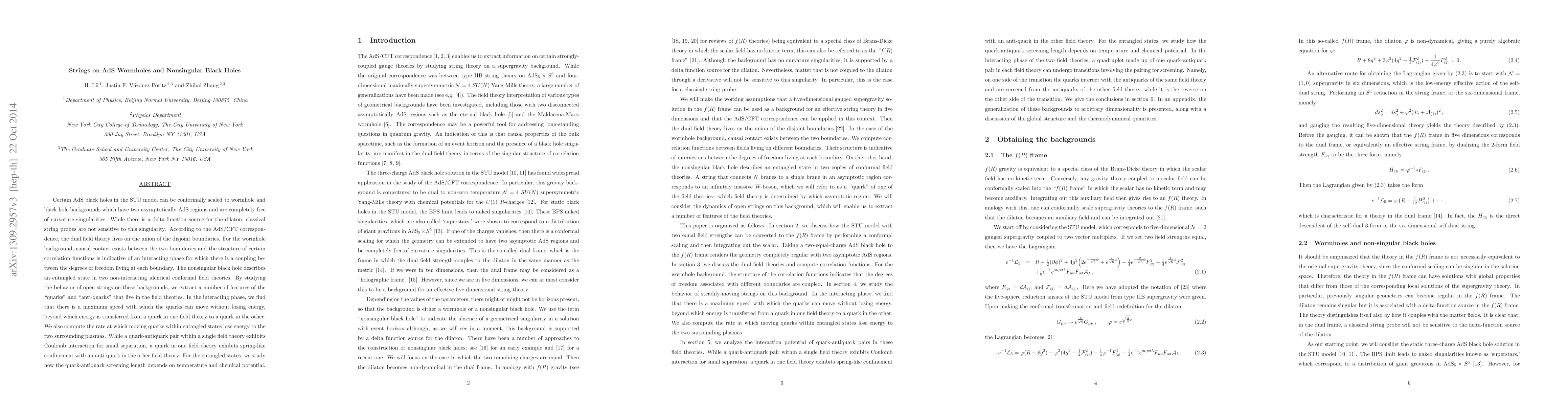 Certain AdS black holes in the STU model can be conformally scaled to wormhole and black hole solutions of an f(R) type theory which have two asymptotically AdS regions and are completely free of curvature singularities. While there is a delta-function source for the dilaton, classical string probes are not sensitive to this singularity. If the AdS/CFT correspondence can be applied in this context, then the wormhole background describes a phase in which two copies of a conformal field theory interact with each other, whereas the nonsingular black hole describes entangled states. By studying the behavior of open strings on these backgrounds, we extract a number of features of the quarks and anti-quarks that live in the field theories. In the interacting phase, we find that there is a maximum speed with which the quarks can move without losing energy, beyond which energy is transferred from a quark in one field theory to a quark in the other. We also compute the rate at which moving quarks within entangled states lose energy to the two surrounding plasmas. While a quark-antiquark pair within a single field theory exhibits Coulomb interaction for small separation, a quark in one field theory exhibits spring-like confinement with an anti-quark in the other field theory. For the entangled states, we study how the quark-antiquark screening length depends on temperature and chemical potential. In the interacting phase of the two field theories, a quadruplet made up of one quark-antiquark pair in each field theory can undergo transitions involving how the quarks and antiquarks are paired in terms of the screening.