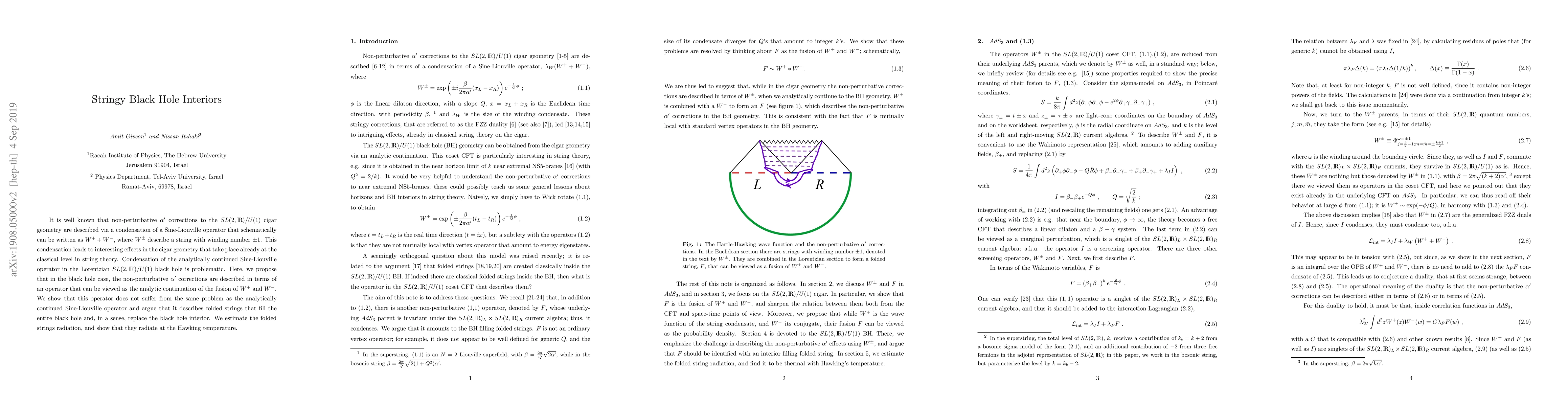 It is well known that non-perturbative $\alpha'$ corrections to the $SL(2,\IR)/U(1)$ cigar geometry are described via a condensation of a Sine-Liouville operator that schematically can be written as $W^{+}+W^{-}$, where $W^{\pm}$ describe a string with winding number $\pm 1$. This condensation leads to interesting effects in the cigar geometry that take place already at the classical level in string theory. Condensation of the analytically continued Sine-Liouville operator in the Lorentzian $SL(2,\IR)/U(1)$ black hole is problematic. Here, we propose that in the black hole case, the non-perturbative $\alpha'$ corrections are described in terms of an operator that can be viewed as the analytic continuation of the fusion of $W^+$ and $W^-$. We show that this operator does not suffer from the same problem as the analytically continued Sine-Liouville operator and argue that it describes folded strings that fill the entire black hole and, in a sense, replace the black hole interior. We estimate the folded strings radiation, and show that they radiate at the Hawking temperature.