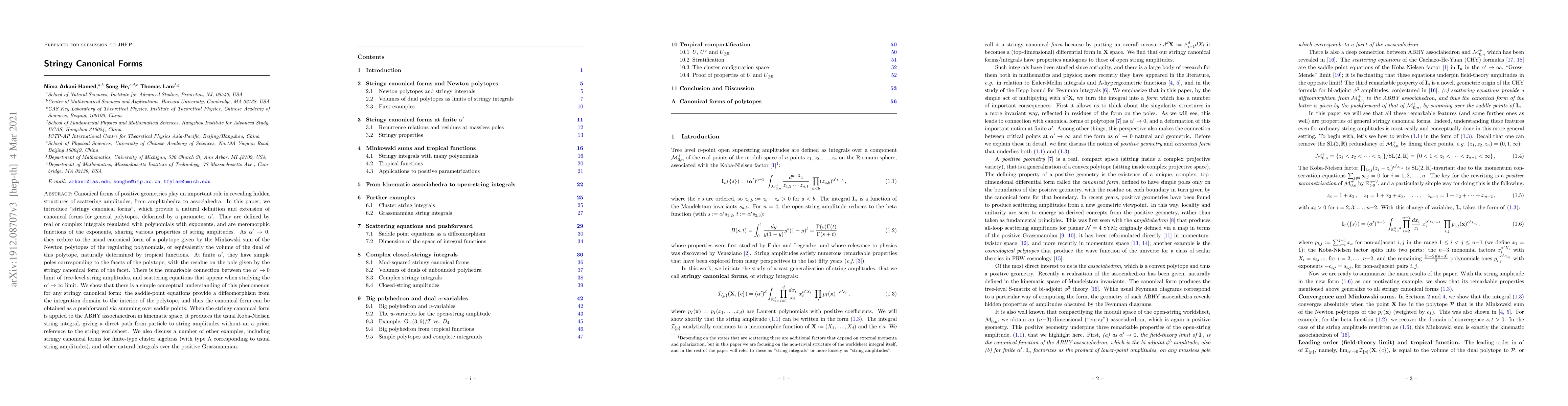 Canonical forms of positive geometries play an important role in revealing hidden structures of scattering amplitudes, from amplituhedra to associahedra. In this paper, we introduce "stringy canonical forms", which provide a natural definition and extension of canonical forms for general polytopes, deformed by a parameter $\alpha'$. They are defined by real or complex integrals regulated with polynomials with exponents, and are meromorphic functions of the exponents, sharing various properties of string amplitudes. As $\alpha' \to 0$, they reduce to the usual canonical form of a polytope given by the Minkowski sum of the Newton polytopes of the regulating polynomials, or equivalently the volume of the dual of this polytope, naturally determined by tropical functions. At finite $\alpha'$, they have simple poles corresponding to the facets of the polytope, with the residue on the pole given by the stringy canonical form of the facet. There is the remarkable connection between the $\alpha' \to 0$ limit of tree-level string amplitudes, and scattering equations that appear when studying the $\alpha' \to \infty$ limit. We show that there is a simple conceptual understanding of this phenomenon for any stringy canonical form: the saddle-point equations provide a diffeomorphism from the integration domain to the interior of the polytope, and thus the canonical form can be obtained as a pushforward via summing over saddle points. When the stringy canonical form is applied to the ABHY associahedron in kinematic space, it produces the usual Koba-Nielsen string integral, giving a direct path from particle to string amplitudes without an a priori reference to the string worldsheet. We also discuss a number of other examples, including stringy canonical forms for finite-type cluster algebras (with type A for string amplitudes), and other natural integrals over the positive Grassmannian.