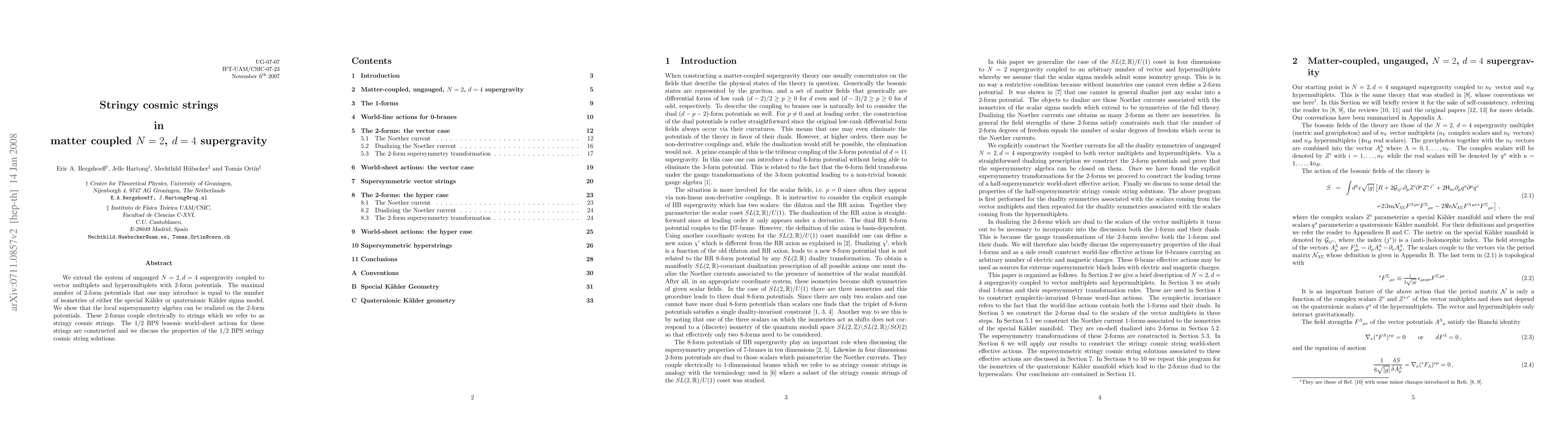 This paper extends N=2, d=4 supergravity to include vector multiplets and hypermultiplets with 2-form potentials, identifying stringy cosmic strings that couple electrically to these potentials. It constructs 1/2 BPS bosonic world-sheet actions and explores the properties of corresponding stringy cosmic string solutions.