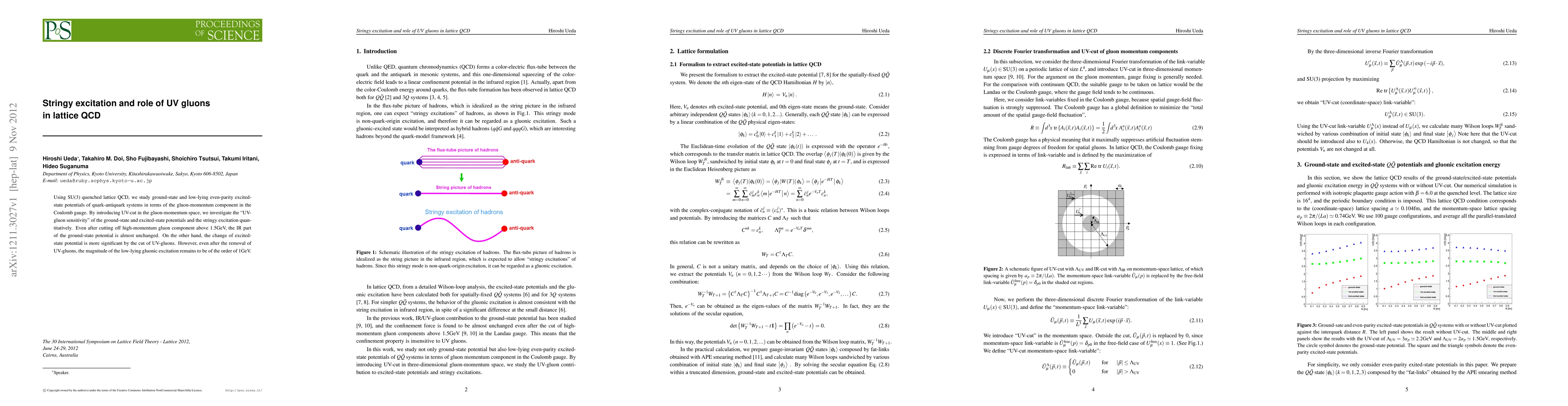 Using SU(3) quenched lattice QCD, we study ground-state and low-lying even-parity excited-state potentials of quark-antiquark systems in terms of the gluon-momentum component in the Coulomb gauge. By introducing UV-cut in the gluon-momentum space, we investigate the "UV-gluon sensitivity" of the ground-state and excited-state potentials and the stringy excitation quantitatively. Even after cutting off high-momentum gluon component above 1.5GeV, the IR part of the ground-state potential is almost unchanged. On the other hand, the change of excited-state potential is more significant by the cut of UV-gluons. However, even after the removal of UV-gluons, the magnitude of the low-lying gluonic excitation remains to be of the order of 1GeV.