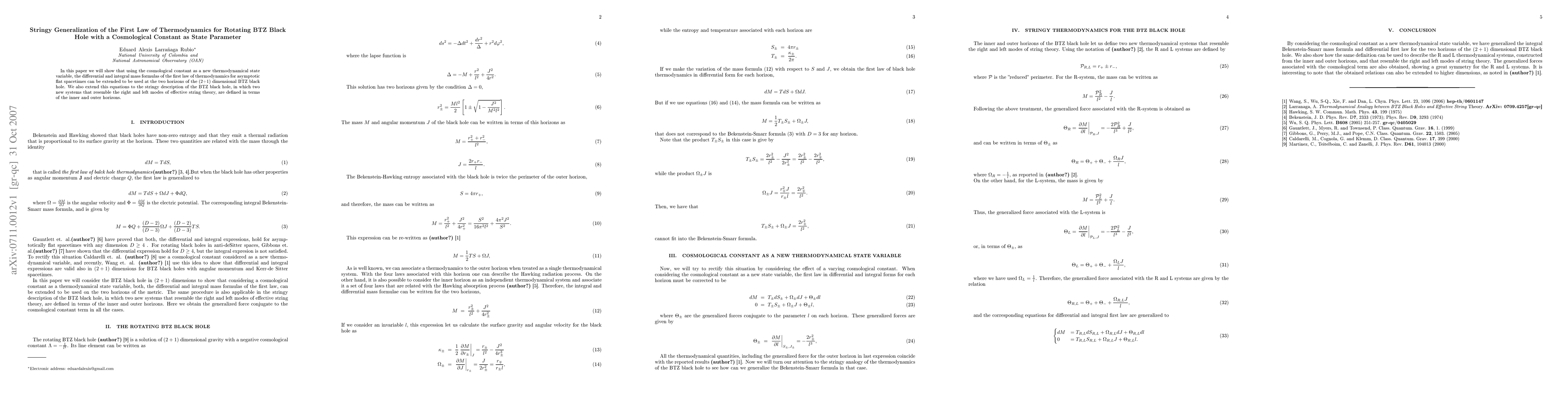 In this paper we will show that using the cosmological constant as a new thermodynamical state variable, the differential and integral mass formulas of the first law of thermodynamics for asymptotic flat spacetimes can be extended to be used at the two horizons of the (2+1) dimensional BTZ black hole. We also extend this equations to the stringy description of the BTZ black hole, in which two new systems that resemble the right and left modes of effective string theory, are defined in terms of the inner and outer horizons.