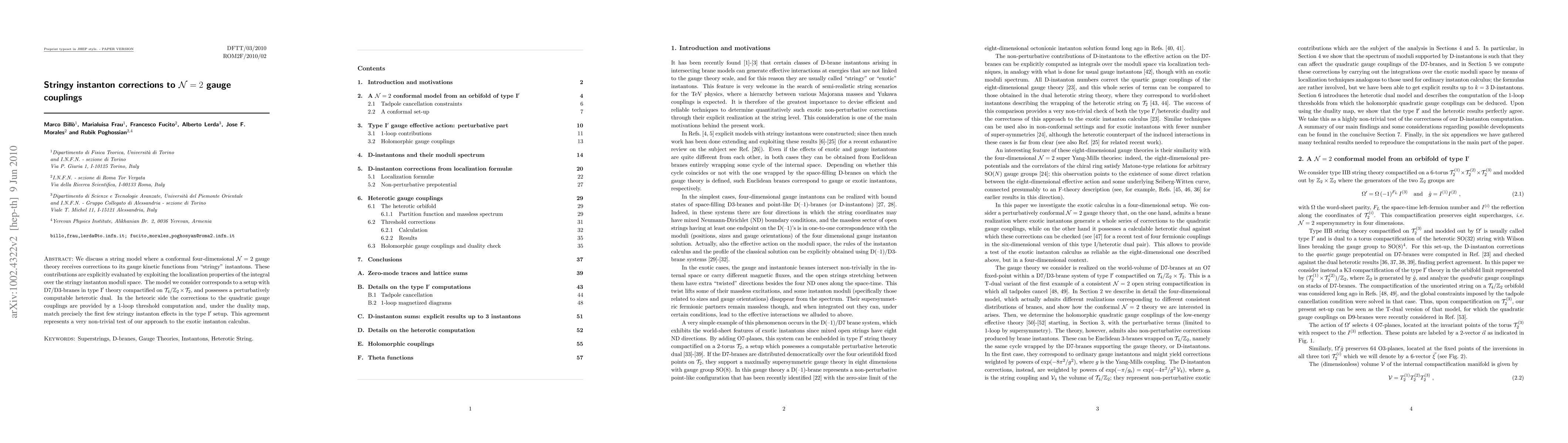 We discuss a string model where a conformal four-dimensional N=2 gauge theory receives corrections to its gauge kinetic functions from "stringy" instantons. These contributions are explicitly evaluated by exploiting the localization properties of the integral over the stringy instanton moduli space. The model we consider corresponds to a setup with D7/D3-branes in type I' theory compactified on T4/Z2 x T2, and possesses a perturbatively computable heterotic dual. In the heteoric side the corrections to the quadratic gauge couplings are provided by a 1-loop threshold computation and, under the duality map, match precisely the first few stringy instanton effects in the type I' setup. This agreement represents a very non-trivial test of our approach to the exotic instanton calculus.