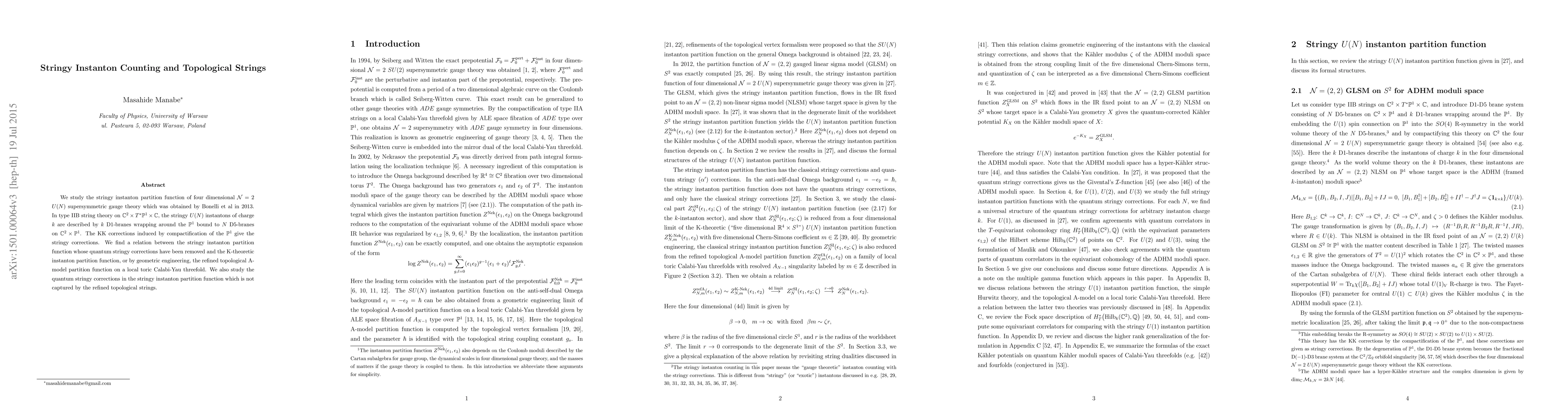 We study the stringy instanton partition function of four dimensional ${\cal N}=2$ $U(N)$ supersymmetric gauge theory which was obtained by Bonelli et al in 2013. In type IIB string theory on $\mathbb{C}^2\times T^*\mathbb{P}^1\times \mathbb{C}$, the stringy $U(N)$ instantons of charge $k$ are described by $k$ D1-branes wrapping around the $\mathbb{P}^1$ bound to $N$ D5-branes on $\mathbb{C}^2\times \mathbb{P}^1$. The KK corrections induced by compactification of the $\mathbb{P}^1$ give the stringy corrections. We find a relation between the stringy instanton partition function whose quantum stringy corrections have been removed and the K-theoretic instanton partition function, or by geometric engineering, the refined topological A-model partition function on a local toric Calabi-Yau threefold. We also study the quantum stringy corrections in the stringy instanton partition function which is not captured by the refined topological strings.