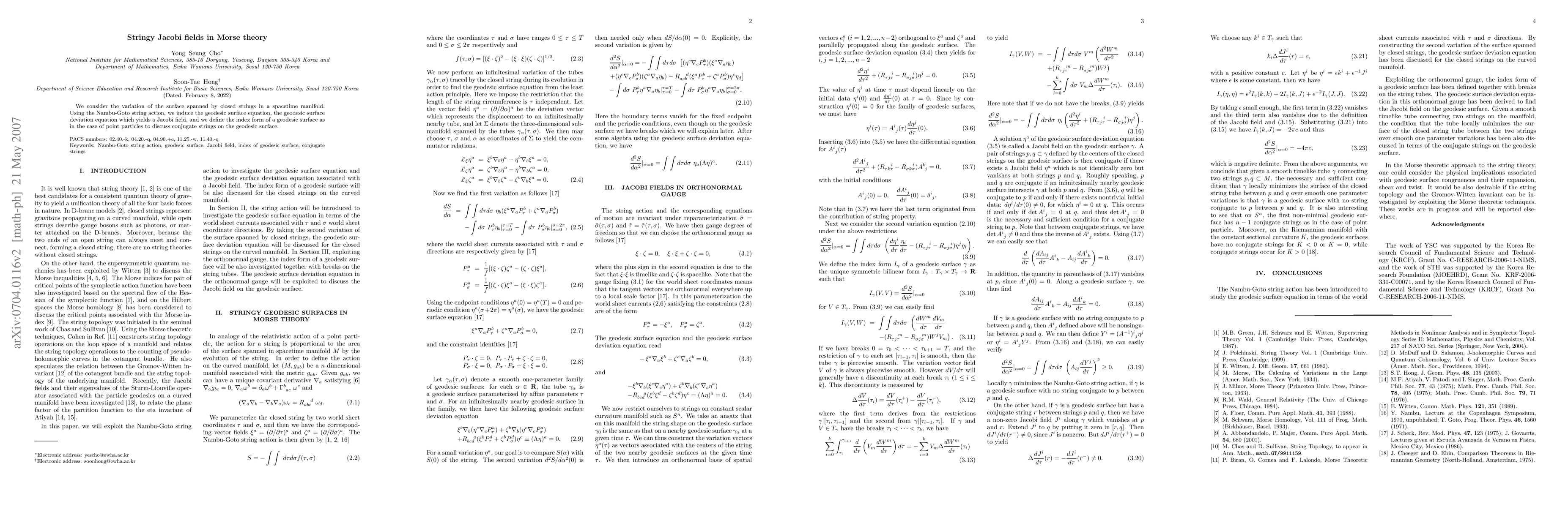 We consider the variation of the surface spanned by closed strings in a spacetime manifold. Using the Nambu-Goto string action, we induce the geodesic surface equation, the geodesic surface deviation equation which yields a Jacobi field, and we define the index form of a geodesic surface as in the case of point particles to discuss conjugate strings on the geodesic surface.