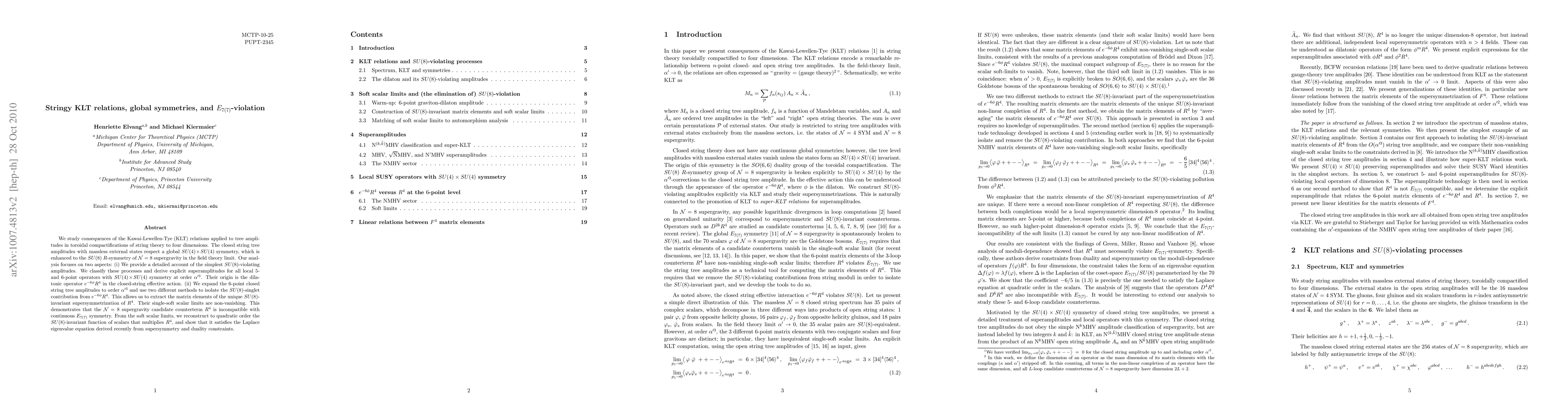 We study consequences of the Kawai-Lewellen-Tye (KLT) relations applied to tree amplitudes in toroidal compactifications of string theory to four dimensions. The closed string tree amplitudes with massless external states respect a global SU(4)xSU(4) symmetry, which is enhanced to the SU(8) R-symmetry of N=8 supergravity in the field theory limit. Our analysis focuses on two aspects: (i) We provide a detailed account of the simplest SU(8)-violating amplitudes. We classify these processes and derive explicit superamplitudes for all local 5- and 6-point operators with SU(4)xSU(4) symmetry at order alpha'^3. Their origin is the dilatonic operator exp(-6 phi) R^4 in the closed-string effective action. (ii) We expand the 6-point closed string tree amplitudes to order alpha'^3 and use two different methods to isolate the SU(8)-singlet contribution from exp(-6 phi) R^4. This allows us to extract the matrix elements of the unique SU(8)-invariant supersymmetrization of R^4. Their single-soft scalar limits are non-vanishing. This demonstrates that the N=8 supergravity candidate counterterm R^4 is incompatible with continuous E_7(7) symmetry. From the soft scalar limits, we reconstruct to quadratic order the SU(8)-invariant function of scalars that multiplies R^4, and show that it satisfies the Laplace eigenvalue equation derived recently from supersymmetry and duality constraints.