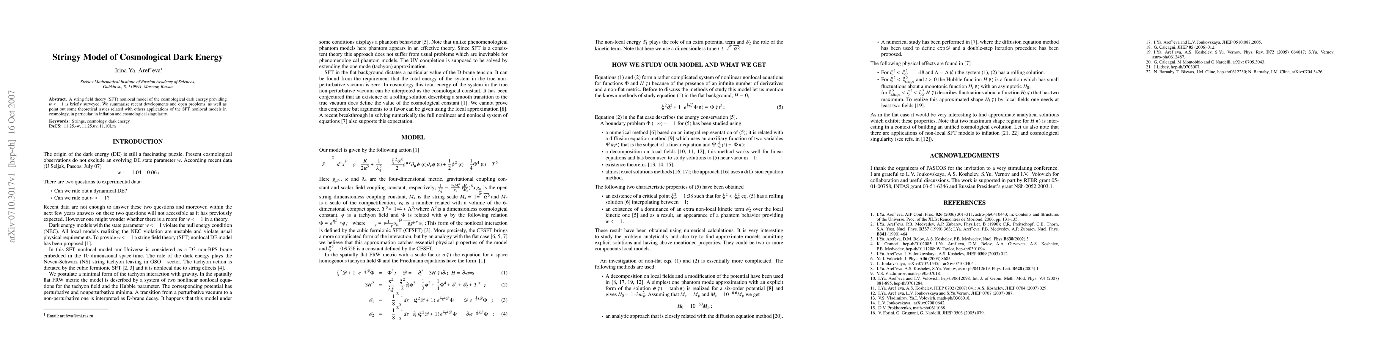 A string field theory(SFT) nonlocal model of the cosmological dark energy providing w<-1 is briefly surveyed. We summarize recent developments and open problems, as well as point out some theoretical issues related with others applications of the SFT nonlocal models in cosmology, in particular, in inflation and cosmological singularity.