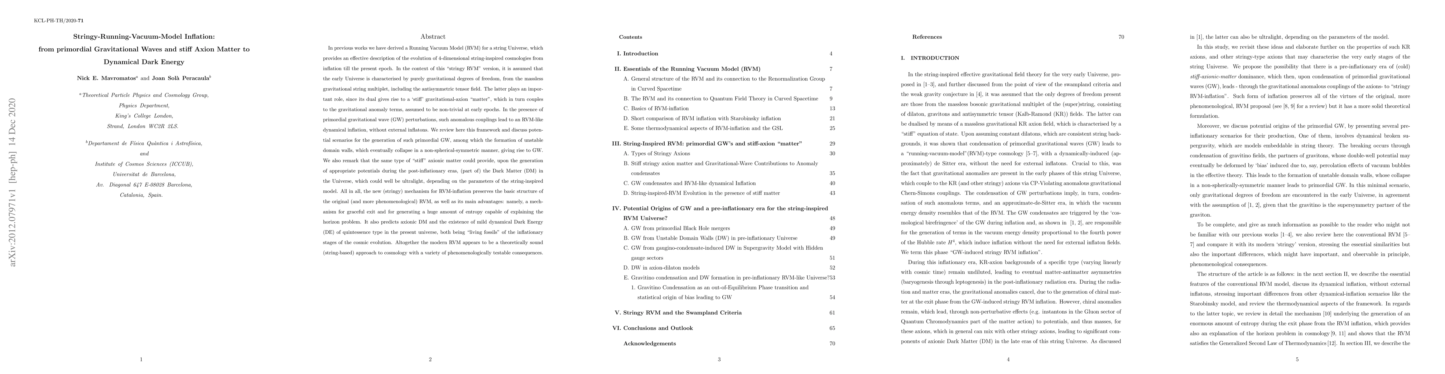 This paper explores a stringy Running Vacuum Model (RVM) for inflation in a string-inspired cosmology, where primordial gravitational waves and "stiff" axion matter drive inflation without external inflatons. It also suggests that this axionic matter could form ultralight dark matter and mild dynamical dark energy.