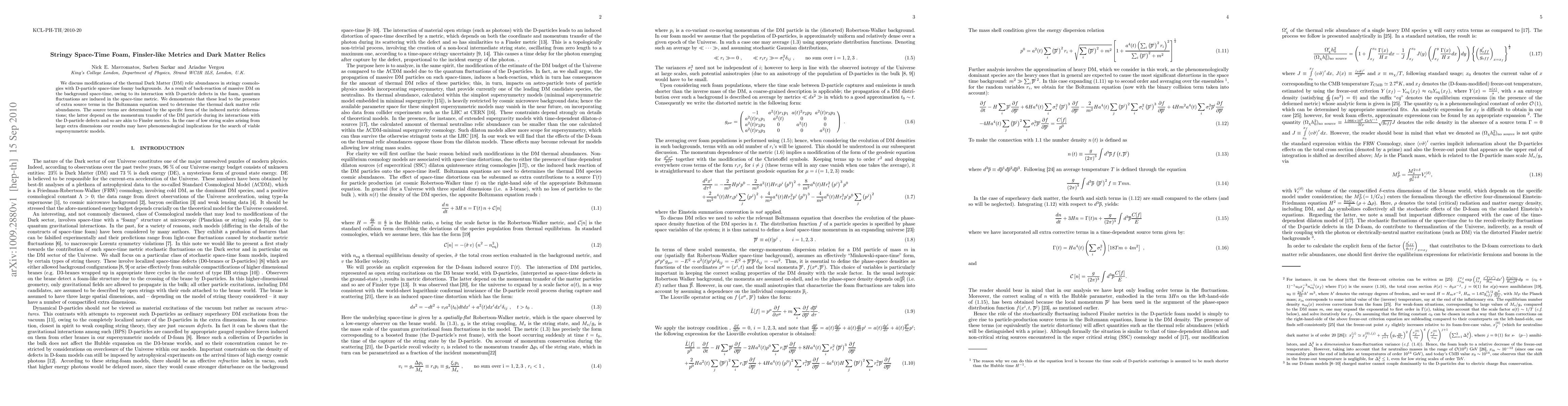 We discuss modifications of the thermal Dark Matter (DM) relic abundances in stringy cosmologies with D-particle space-time foamy backgrounds. As a result of back-reaction of massive DM on the background space-time, owing to its interaction with D-particle defects in the foam, quantum fluctuations are induced in the space-time metric. We demonstrate that these lead to the presence of extra source terms in the Boltzmann equation used to determine the thermal dark matter relic abundances. The source terms are determined by the specific form of the induced metric deformations; the latter depend on the momentum transfer of the DM particle during its interactions with the D-particle defects and so are akin to Finsler metrics. In the case of low string scales arising from large extra dimensions our results may have phenomenological implications for the search of viable supersymmetric models.
