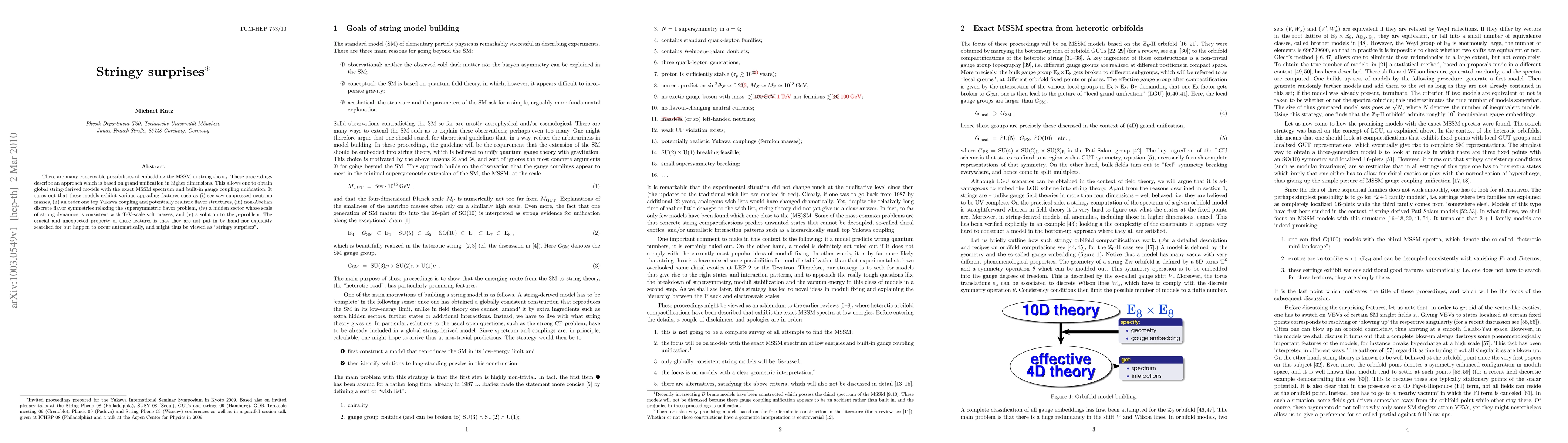 There are many conceivable possibilities of embedding the MSSM in string theory. These proceedings describe an approach which is based on grand unification in higher dimensions. This allows one to obtain global string-derived models with the exact MSSM spectrum and built-in gauge coupling unification. It turns out that these models exhibit various appealing features such as (i) see-saw suppressed neutrino masses, (ii) an order one top Yukawa coupling and potentially realistic flavor structures, (iii) non-Abelian discrete flavor symmetries relaxing the supersymmetric flavor problem, (iv) a hidden sector whose scale of strong dynamics is consistent with TeV-scale soft masses, and (v) a solution to the mu-problem. The crucial and unexpected property of these features is that they are not put in by hand nor explicitly searched for but happen to occur automatically, and might thus be viewed as "stringy surprises".