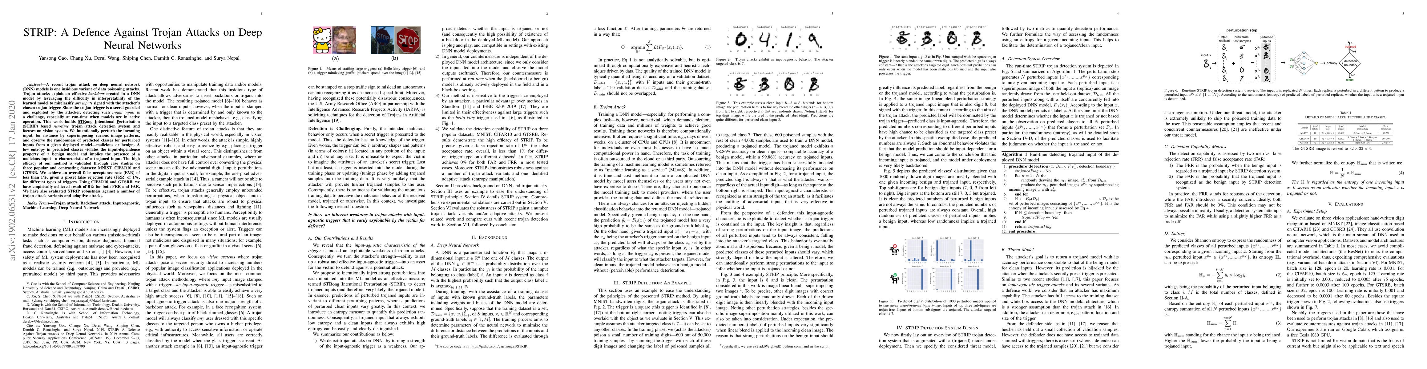 The paper introduces STRIP, a run-time trojan attack detection system for deep neural networks that intentionally perturbs inputs to identify low entropy in predicted classes, indicating the presence of trojan triggers. The method is validated across MNIST, CIFAR10, and GTSRB datasets, achieving less than 1% false acceptance rate with a 1% false rejection rate.