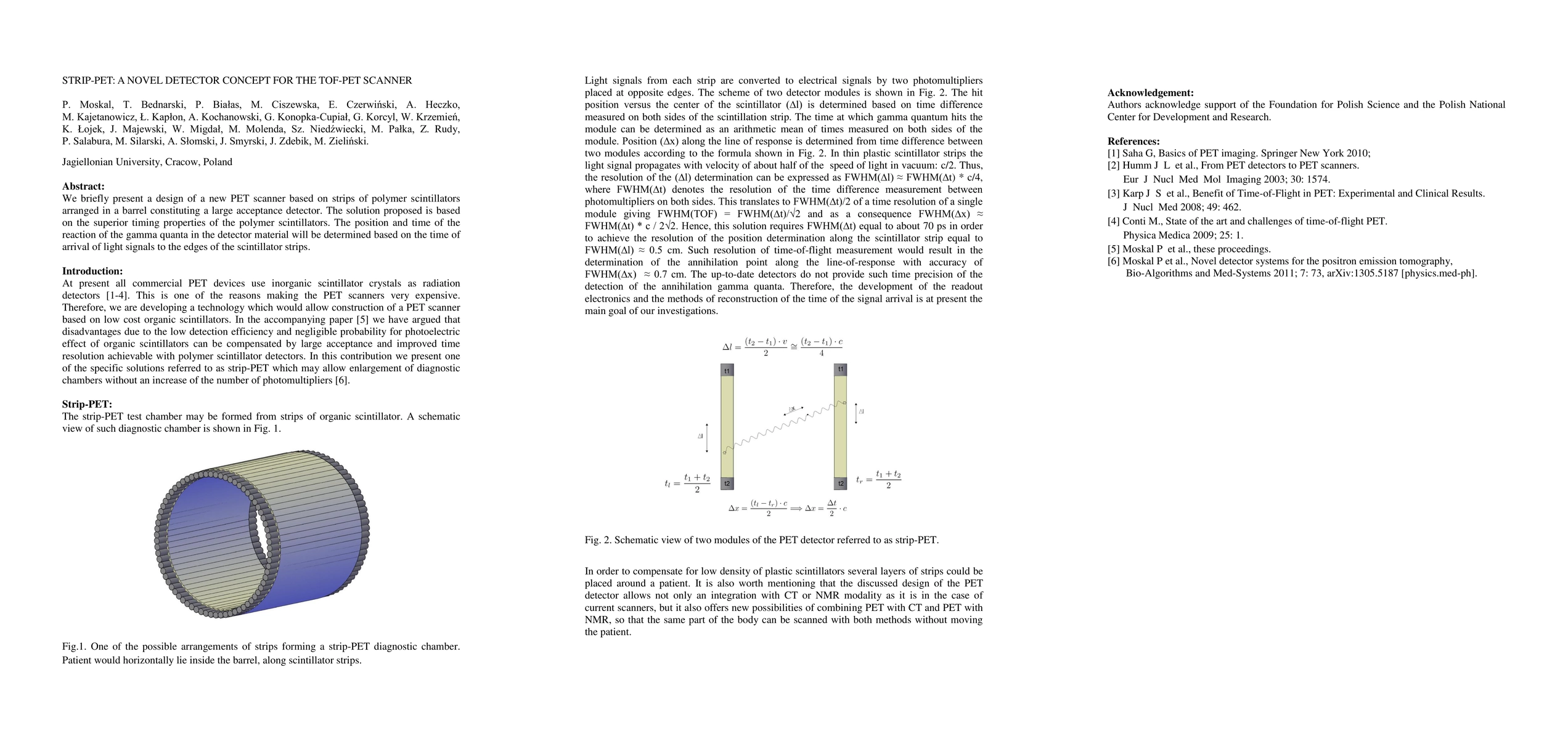 A new PET scanner design uses strips of polymer scintillators to detect gamma quanta, leveraging their superior timing properties for precise position and time determination.