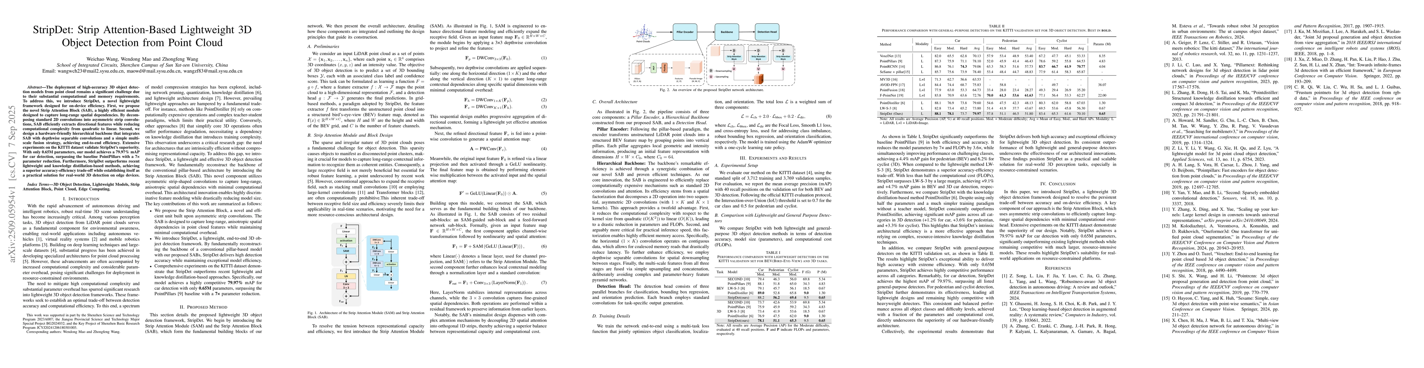The deployment of high-accuracy 3D object detection models from point cloud remains a significant challenge due to their substantial computational and memory requirements. To address this, we introduce StripDet, a novel lightweight framework designed for on-device efficiency. First, we propose the novel Strip Attention Block (SAB), a highly efficient module designed to capture long-range spatial dependencies. By decomposing standard 2D convolutions into asymmetric strip convolutions, SAB efficiently extracts directional features while reducing computational complexity from quadratic to linear. Second, we design a hardware-friendly hierarchical backbone that integrates SAB with depthwise separable convolutions and a simple multiscale fusion strategy, achieving end-to-end efficiency. Extensive experiments on the KITTI dataset validate StripDet's superiority. With only 0.65M parameters, our model achieves a 79.97% mAP for car detection, surpassing the baseline PointPillars with a 7x parameter reduction. Furthermore, StripDet outperforms recent lightweight and knowledge distillation-based methods, achieving a superior accuracy-efficiency trade-off while establishing itself as a practical solution for real-world 3D detection on edge devices.
