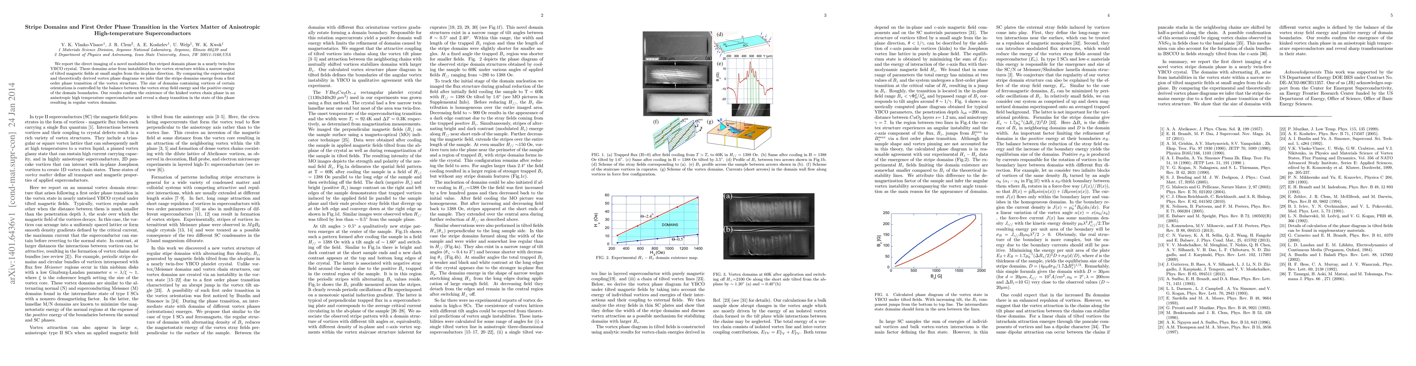 This paper reports the direct imaging of a novel striped flux domain phase in a YBCO crystal, revealing its emergence from a first order phase transition in the vortex structure under specific magnetic field angles. The study confirms the existence of a kinked vortex chain phase and highlights the sharp transition leading to regular vortex domains, controlled by the balance of energy factors.