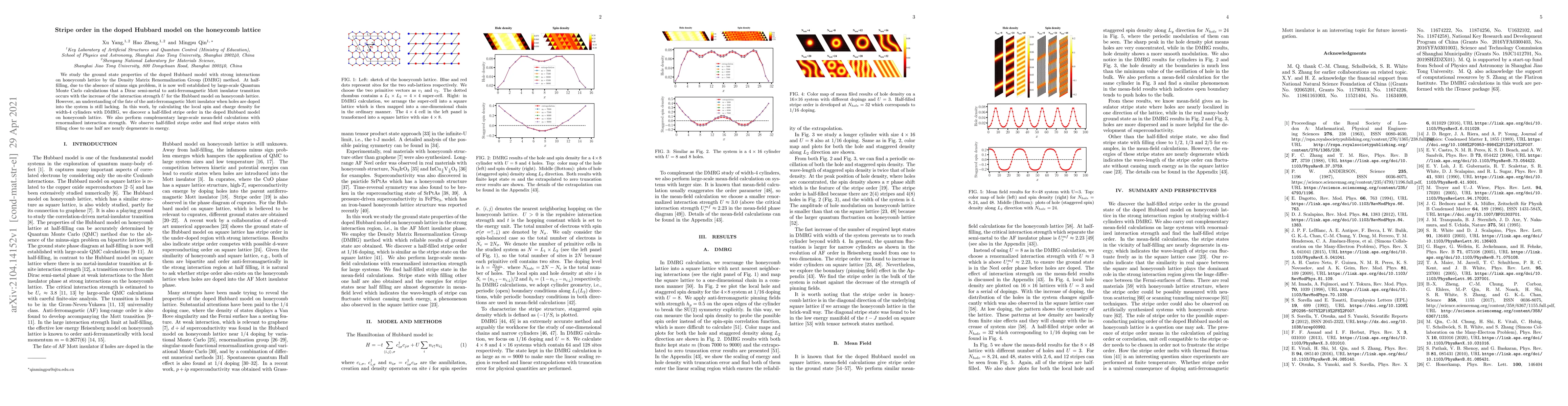 This study uses Density Matrix Renormalization Group (DMRG) to investigate the doped Hubbard model on a honeycomb lattice, discovering a half-filled stripe order. Complementary mean-field calculations show that these stripe states are nearly degenerate in energy, indicating a complex interplay between magnetism and doping.