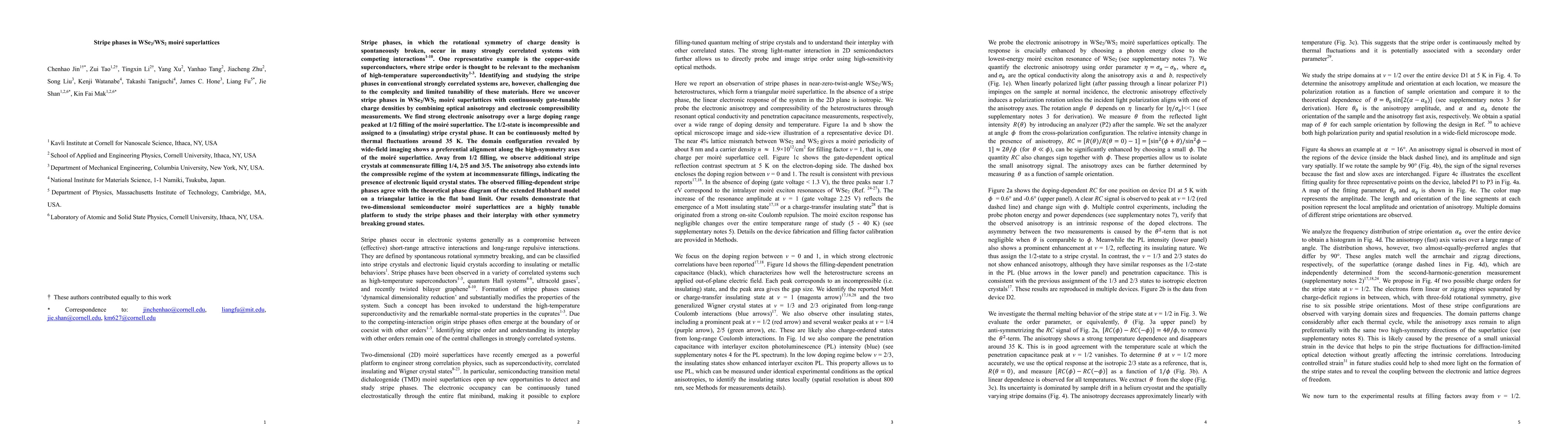 Researchers discovered stripe phases in WSe2/WS2 moiré superlattices, characterized by broken rotational symmetry in charge density, using gate-tunable charge densities and optical anisotropy measurements. The study found an insulating stripe crystal phase at 1/2 filling, which transforms with thermal fluctuations, and additional stripe crystals at other fillings, aligning with theoretical predictions.