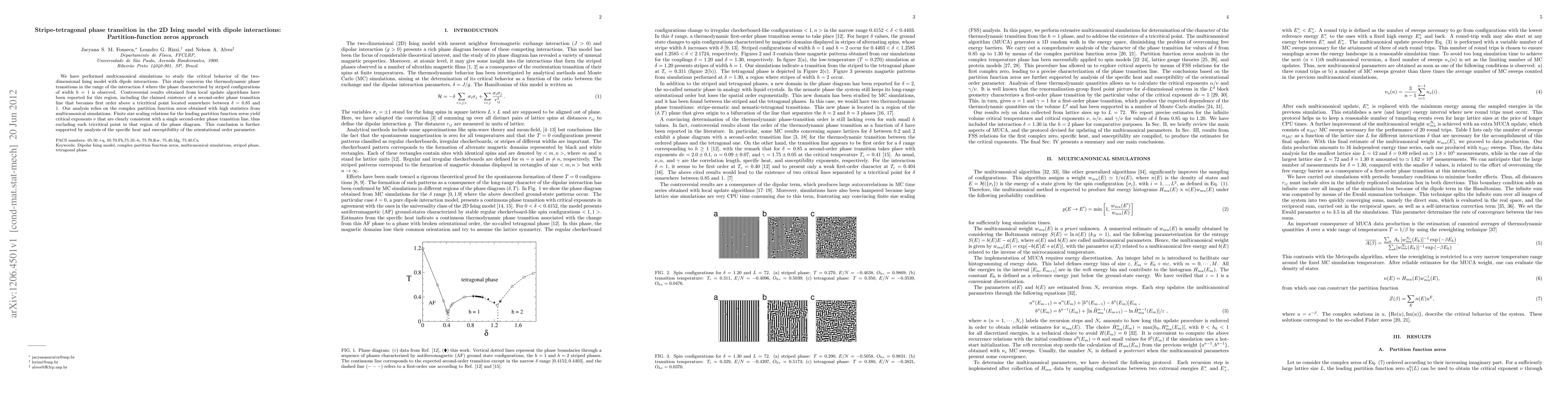 We have performed multicanonical simulations to study the critical behavior of the two-dimensional Ising model with dipole interactions. This study concerns the thermodynamic phase transitions in the range of the interaction \delta where the phase characterized by striped configurations of width h=1 is observed. Controversial results obtained from local update algorithms have been reported for this region, including the claimed existence of a second-order phase transition line that becomes first order above a tricritical point located somewhere between \delta=0.85 and 1. Our analysis relies on the complex partition function zeros obtained with high statistics from multicanonical simulations. Finite size scaling relations for the leading partition function zeros yield critical exponents \nu that are clearly consistent with a single second-order phase transition line, thus excluding such tricritical point in that region of the phase diagram. This conclusion is further supported by analysis of the specific heat and susceptibility of the orientational order parameter.