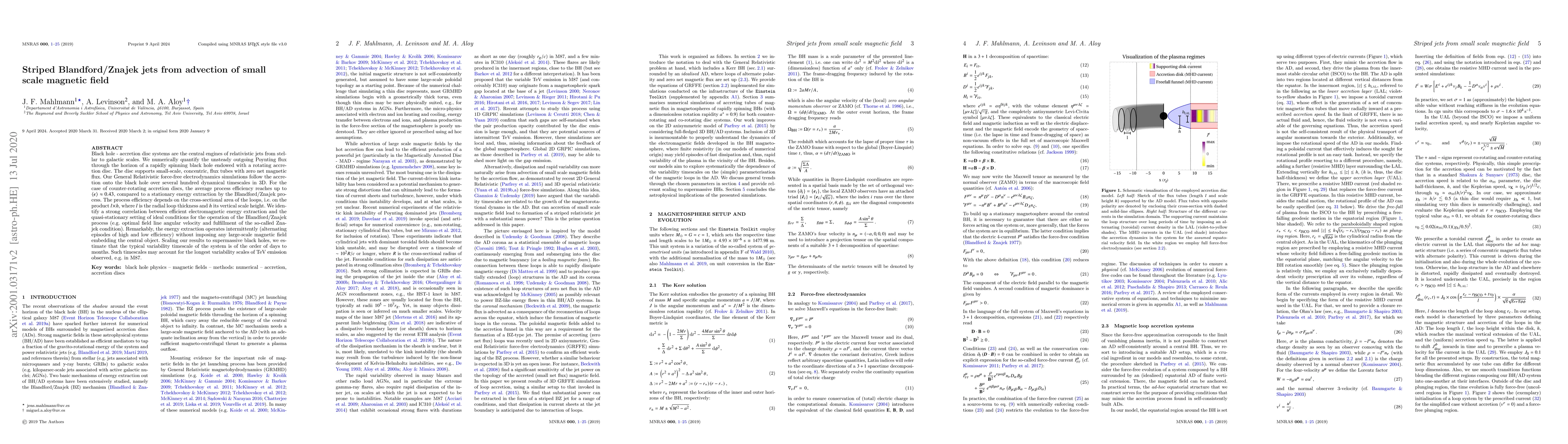 Black hole - accretion disc systems are the central engines of relativistic jets from stellar to galactic scales. We numerically quantify the unsteady outgoing Poynting flux through the horizon of a rapidly spinning black hole endowed with a rotating accretion disc. The disc supports small-scale, concentric, flux tubes with zero net magnetic flux. Our General Relativistic force-free electrodynamics simulations follow the accretion onto the black hole over several hundred dynamical timescales in 3D. For the case of counter-rotating accretion discs, the average process efficiency reaches up to $\left\langle\epsilon\right\rangle\approx 0.43$, compared to a stationary energy extraction by the Blandford/Znajek process. The process efficiency depends on the cross-sectional area of the loops, i.e. on the product $l\times h$, where $l$ is the radial loop thickness and $h$ its vertical scale height. We identify a strong correlation between efficient electromagnetic energy extraction and the quasi-stationary setting of ideal conditions for the operation of the Blandford/Znajek process (e.g. optimal field line angular velocity and fulfillment of the so-called Znajek condition). Remarkably, the energy extraction operates intermittently (alternating episodes of high and low efficiency) without imposing any large-scale magnetic field embedding the central object. Scaling our results to supermassive black holes, we estimate that the typical variability timescale of the system is of the order of days to months. Such timescales may account for the longest variability scales of TeV emission observed, e.g. in M87.