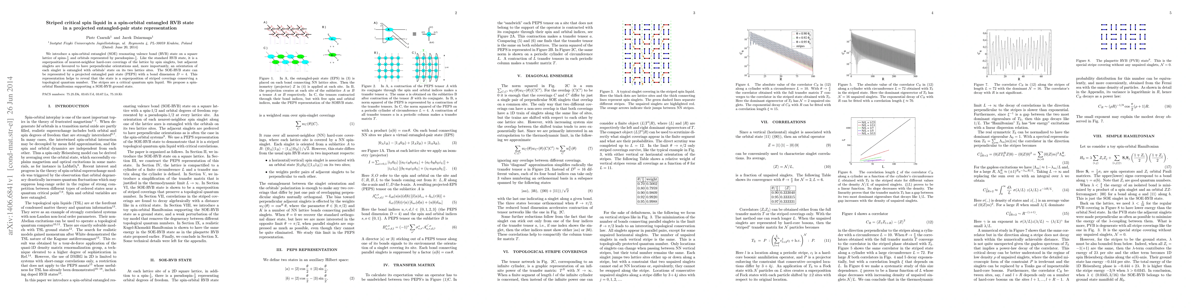 This paper introduces a spin-orbital entangled resonating valence bond state on a square lattice, represented by a projected entangled-pair state with a bond dimension of 4. The state is a critical quantum spin liquid characterized by striped coverings conserving a topological quantum number.