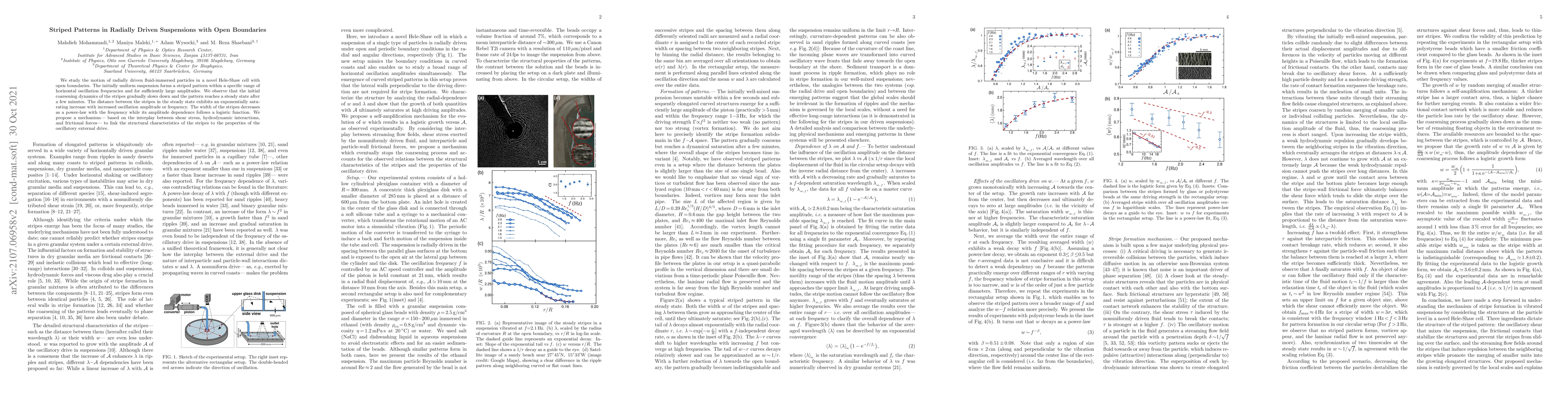 Researchers studied striped patterns in fluid-immersed particles driven by oscillations in a Hele-Shaw cell with open boundaries, finding that the pattern evolves over time and is influenced by amplitude and frequency of the drive.
