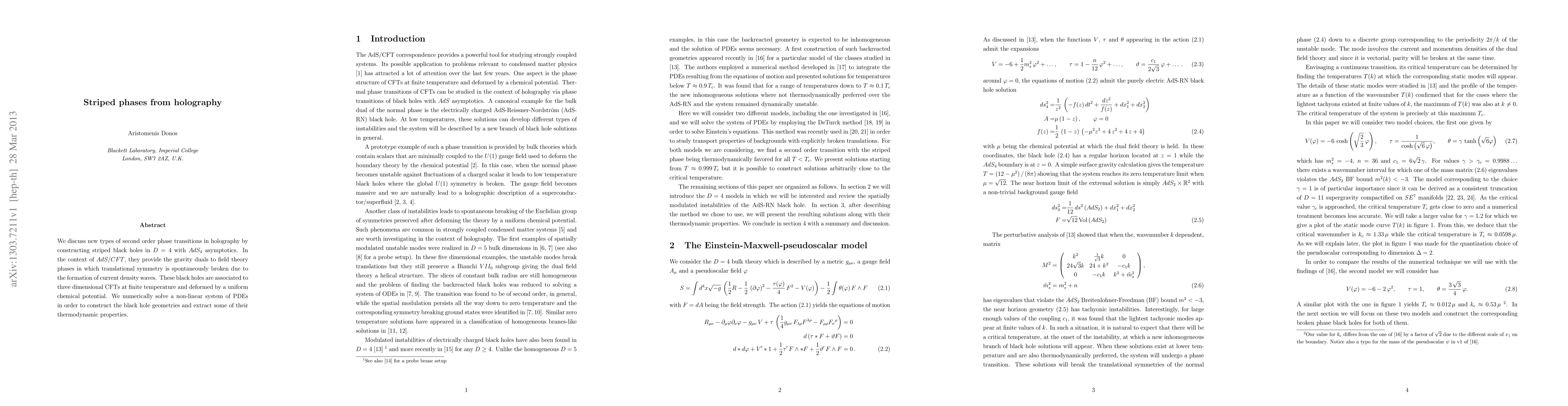 This paper explores new types of second-order phase transitions in holography through the construction of striped black holes in D=4 with $AdS_{4}$ asymptotics, which correspond to current density wave phases in the dual field theory. The study uses numerical methods to solve PDEs and analyze the thermodynamic properties of these black hole geometries.
