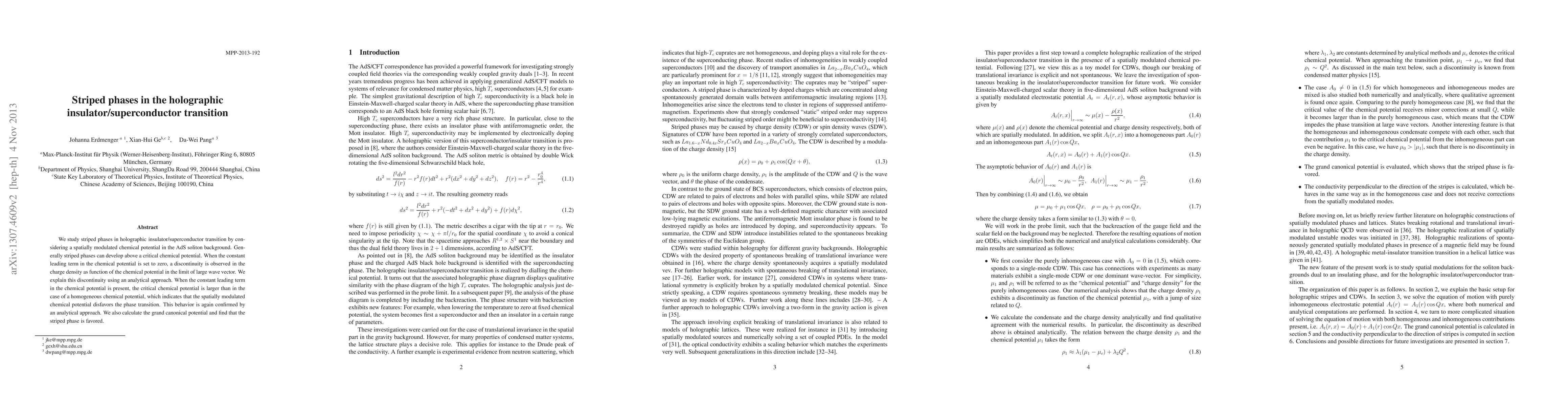 This paper investigates striped phases in the holographic insulator/superconductor transition using a spatially modulated chemical potential in an AdS soliton background. It finds that striped phases emerge above a critical chemical potential, with a discontinuity in the charge density versus chemical potential plot observed in the large wave vector limit when the leading term in the chemical potential is zero.