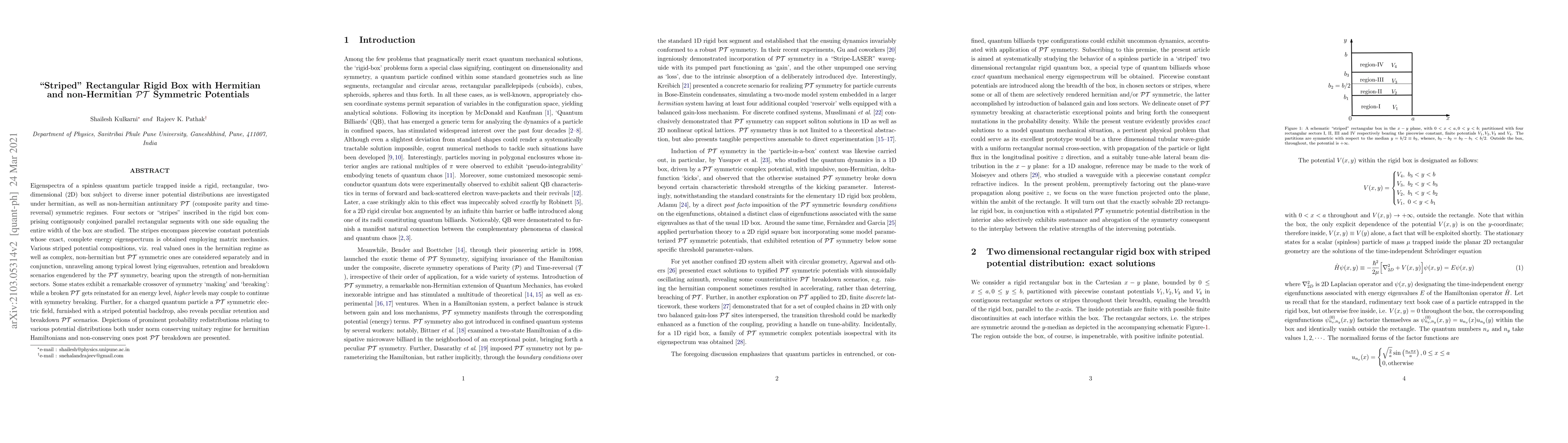 This paper investigates the eigenspectra of a quantum particle in a rectangular box with striped potentials under both Hermitian and non-Hermitian $\mathcal{PT}$ symmetric conditions. It explores how $\mathcal{PT}$ symmetry affects energy levels and probability distributions across different potential configurations, revealing complex behaviors such as symmetry crossover and breakdown.