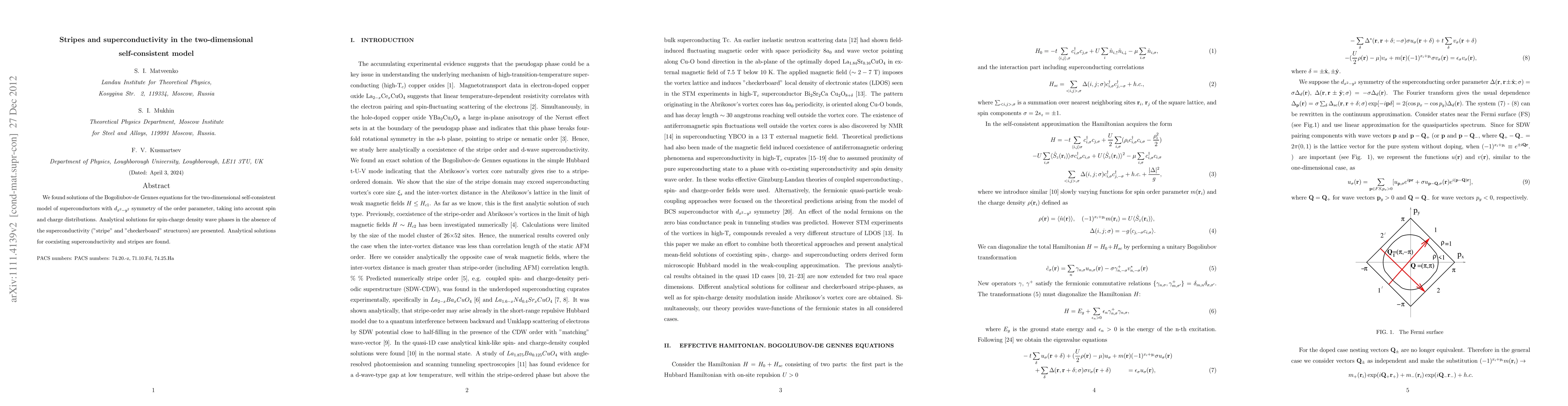 We found solutions of the Bogoliubov-de Gennes equations for the two-dimensional self-consistent model of superconductors with $d_{x^2-y^2}$ symmetry of the order parameter, taking into account spin and charge distributions. Analytical solutions for spin-charge density wave phases in the absence of the superconductivity ("stripe" and "checkerboard" structures) are presented. Analytical solutions for coexisting superconductivity and stripes are found.
