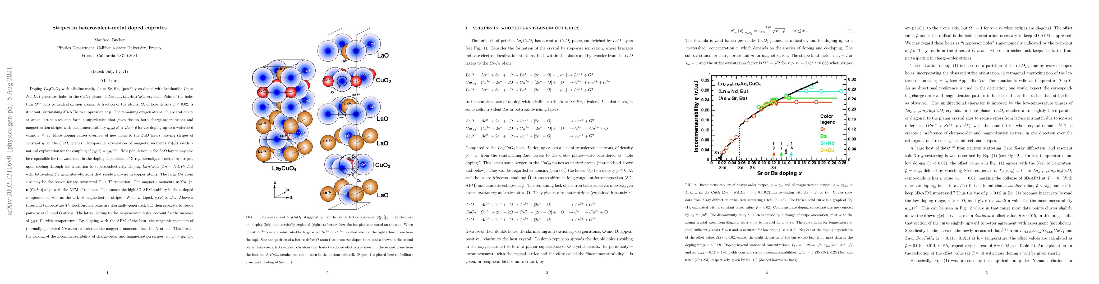 Doping $La_2CuO_{4}$ with alkaline-earth, $Ae= Sr,Ba$ generates holes in $La_{2-y-x}Ln_yAe_xCuO_{4}$ ($Ln =$ $Nd,Eu$). A small fraction of the holes, $\check{p} \le $ $0.02$, suppresses 3D-AFM. The rest resides as double holes at $O$ atoms in the $CuO_2$ planes. The superlattice, formed by the $O$ atoms, gives rise to both charge order stripes and magnetization stripes with incommensurability $q_{c,m}(x) \propto \sqrt{x-\check{p}}$ for $Ae$ doping $x < \hat{x}$, but constant $q_c$ beyond. Antiparallel orientation of magnetic moments $\mathbf{m}(O)$ yields a natural explanation for the coupling of $q_m(x) = \frac{1}{2} q_c(x)$. Doping $Nd_2CuO_{4}$ with $Ce$ generates electrons that reside pairwise in copper atoms. This accounts for the different properties of $n$-doped compounds. When $n$-doped, $q_c(x) \propto \sqrt{x}$. Above a threshold temperature $T'$, electron-hole pairs are thermally generated, but then separate to reside pairwise at $Cu$ and $O$ atoms. This breaks the locking of the incommensurability of charge order and magnetization stripes, $q_m(x) \ne \frac{1}{2} q_c(x)$.