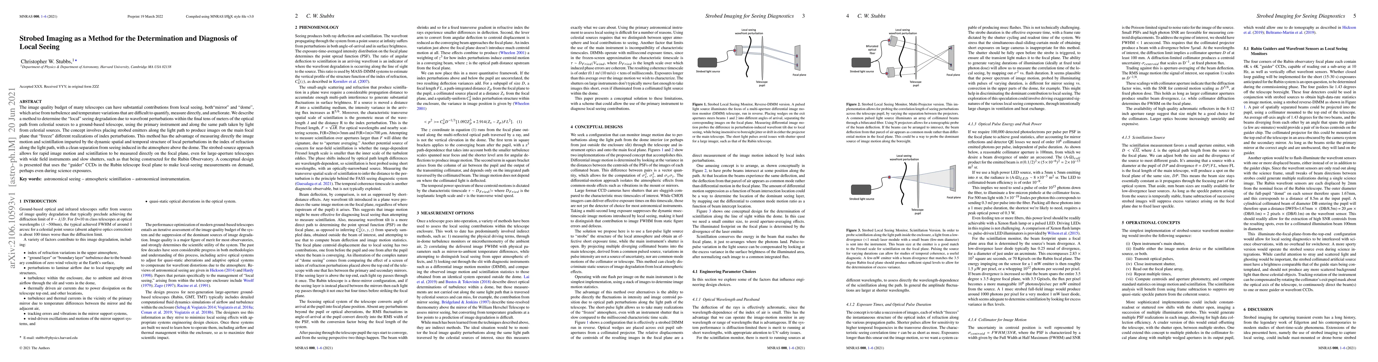 Strobed imaging employs strobed emitters along the optical path to measure local seeing degradation caused by wavefront perturbations, providing a direct assessment of image motion and scintillation. This method allows for real-time local-seeing measurements using the telescope's guider CCDs, even during science observations.