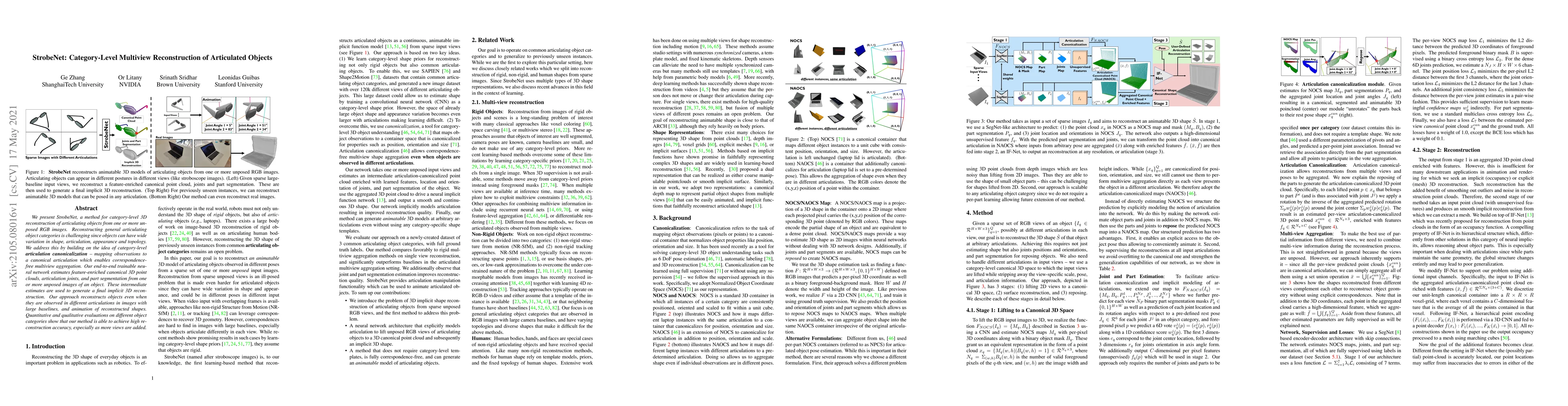 StrobeNet reconstructs category-level 3D models of articulated objects from unposed RGB images by using category-level articulation canonicalization. The method estimates canonical 3D point clouds and joint articulations, achieving high reconstruction accuracy, especially with more input views.
