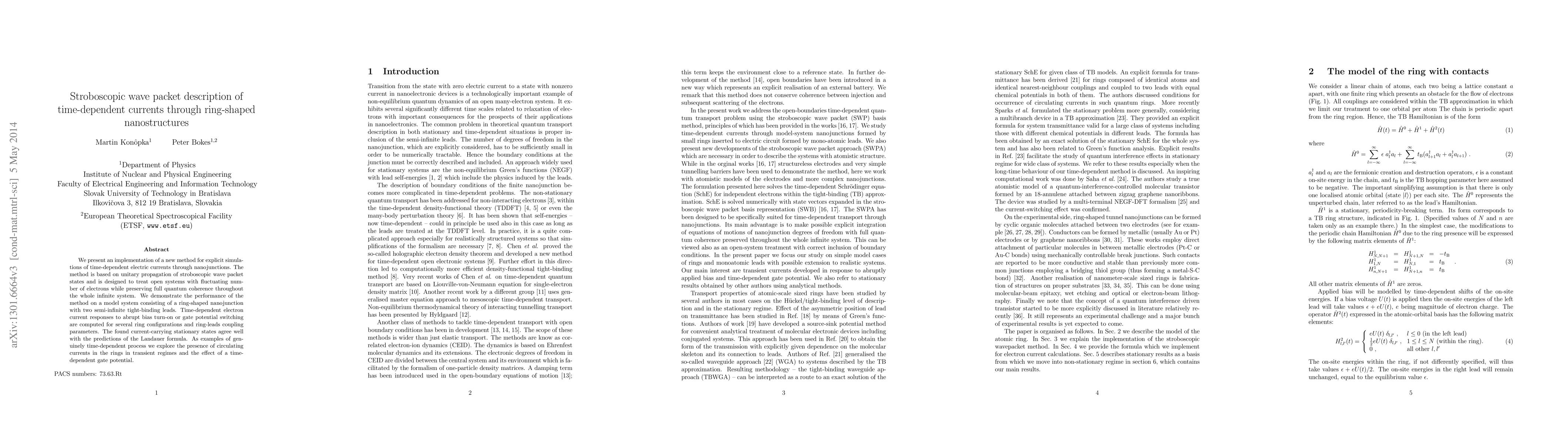 We present an implementation of a new method for explicit simulations of time-dependent electric currents through nanojunctions. The method is based on unitary propagation of stroboscopic wave packet states and is designed to treat open systems with fluctuating number of electrons while preserving full quantum coherence throughout the whole infinite system. We demonstrate the performance of the method on a model system consisting of a ring-shaped nanojunction with two semi-infinite tight-binding leads. Time-dependent electron current responses to abrupt bias turn-on or gate potential switching are computed for several ring configurations and ring-leads coupling parameters. The found current-carrying stationary states agree well with the predictions of the Landauer formula. As examples of genuinely time-dependent process we explore the presence of circulating currents in the rings in transient regimes and the effect of a time-dependent gate potential.