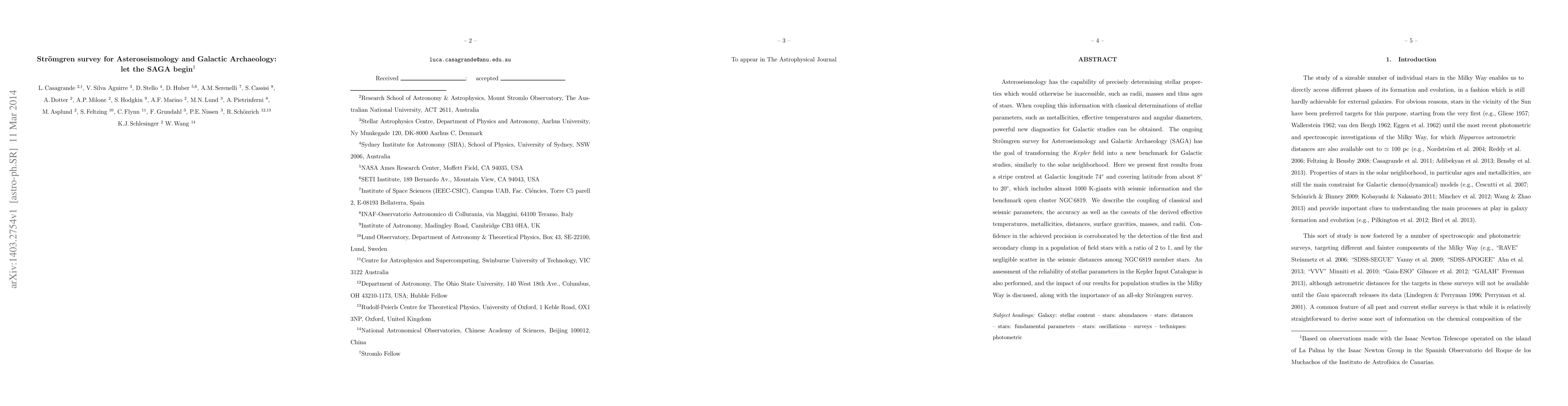The Stroemgren survey for Asteroseismology and Galactic Archaeology (SAGA) aims to combine asteroseismic and classical stellar data to enhance Galactic studies. Initial results from a survey stripe reveal precise stellar parameters, validated by clear detection of stellar clumps and minimal distance scatter among cluster stars, underscoring the survey's potential for Milky Way population studies.