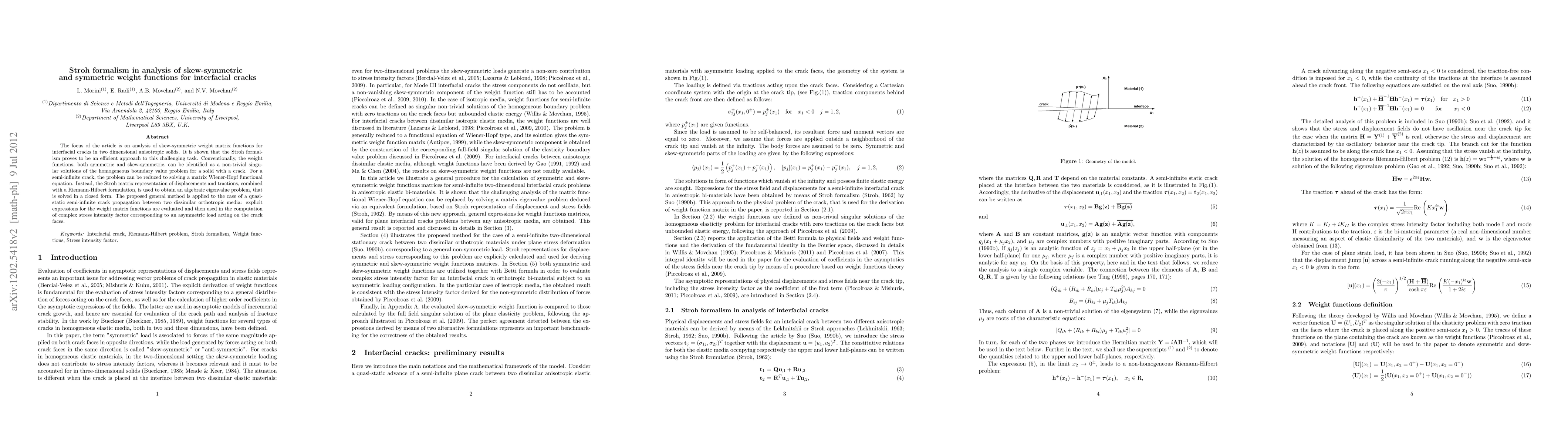 This paper utilizes the Stroh formalism to analyze skew-symmetric and symmetric weight matrix functions for interfacial cracks in anisotropic solids. The method transforms the problem into an algebraic eigenvalue problem, providing closed-form solutions for the weight functions and facilitating the computation of stress intensity factors for semi-infinite crack propagation between dissimilar orthotropic media.