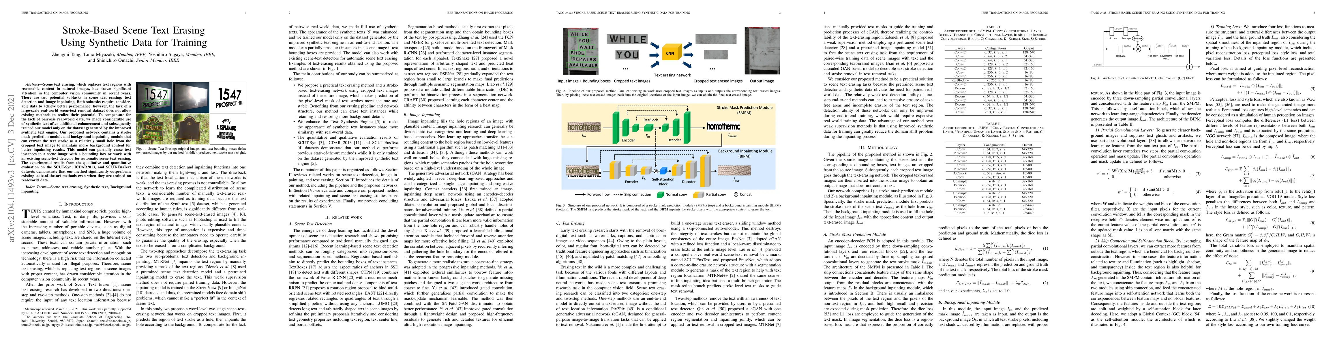 This paper proposes a method for scene text erasing using synthetic data enhanced by a synthetic text engine, which trains a network with a stroke mask prediction and background inpainting module. The model outperforms existing methods, demonstrating superior performance on multiple datasets despite being trained only on synthetic data.