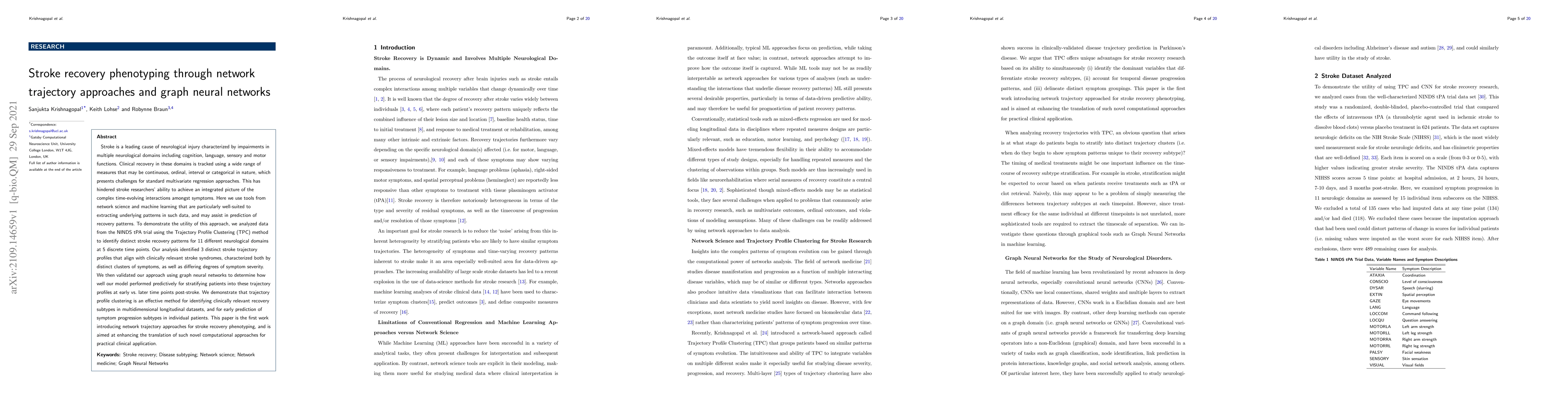 This paper introduces network trajectory approaches and graph neural networks to phenotype stroke recovery by identifying distinct recovery patterns across multiple neurological domains. The study identifies three stroke recovery profiles using Trajectory Profile Clustering and validates them with graph neural networks, demonstrating effective prediction of recovery subtypes and potential for clinical application.
