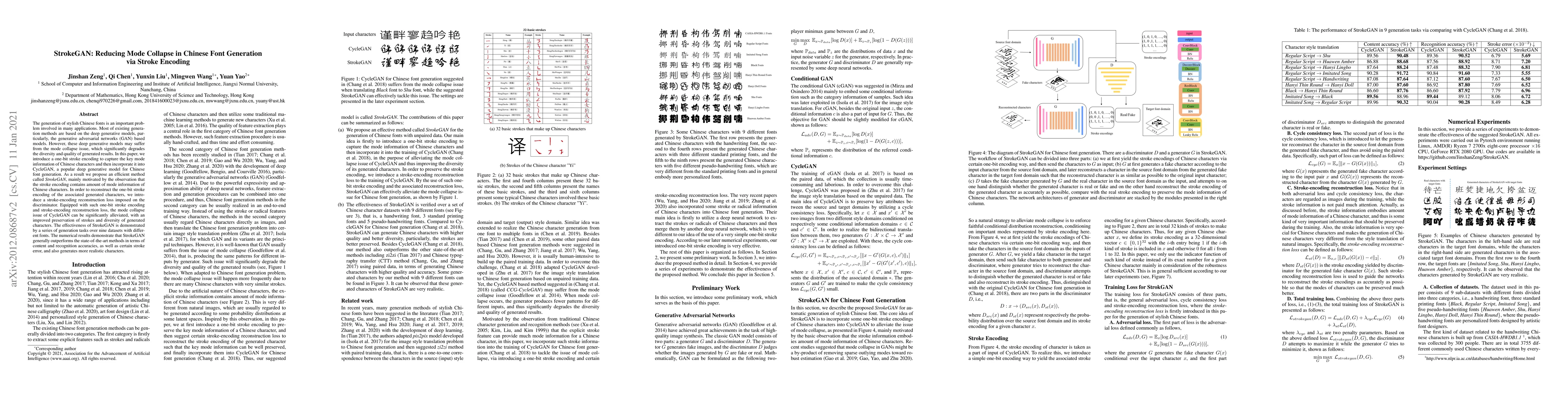 StrokeGAN introduces a one-bit stroke encoding to enhance CycleGAN for generating diverse and high-quality Chinese fonts, significantly reducing mode collapse issues. The method employs a stroke-encoding reconstruction loss to improve character diversity and stroke preservation.