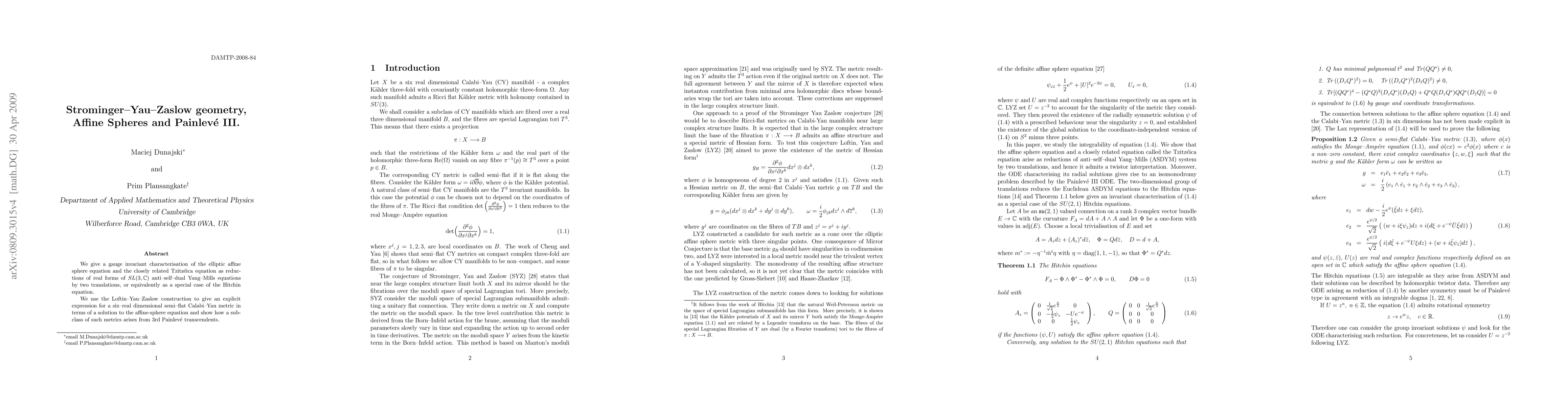 Researchers establish a connection between the affine sphere equation, Tzitz'eica equation, and the Hitchin equation, revealing a gauge invariant characterization of these equations. They also show how a subclass of Calabi-Yau metrics arises from solutions to the 3rd Painlev'e transcendents.