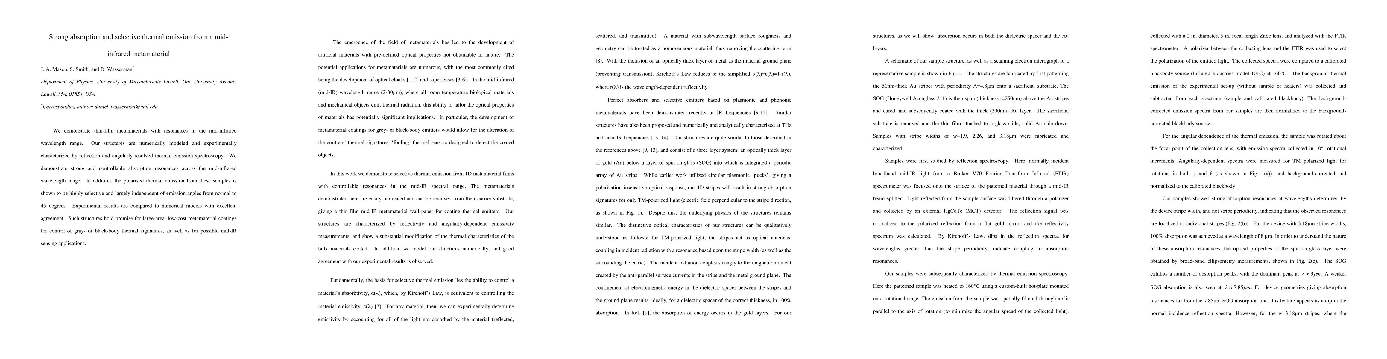 This paper presents thin-film metamaterials that exhibit strong and controllable absorption in the mid-infrared range, along with highly selective polarized thermal emission. Experimental results match numerical models, indicating potential for low-cost, large-area applications in thermal signature control and mid-IR sensing.