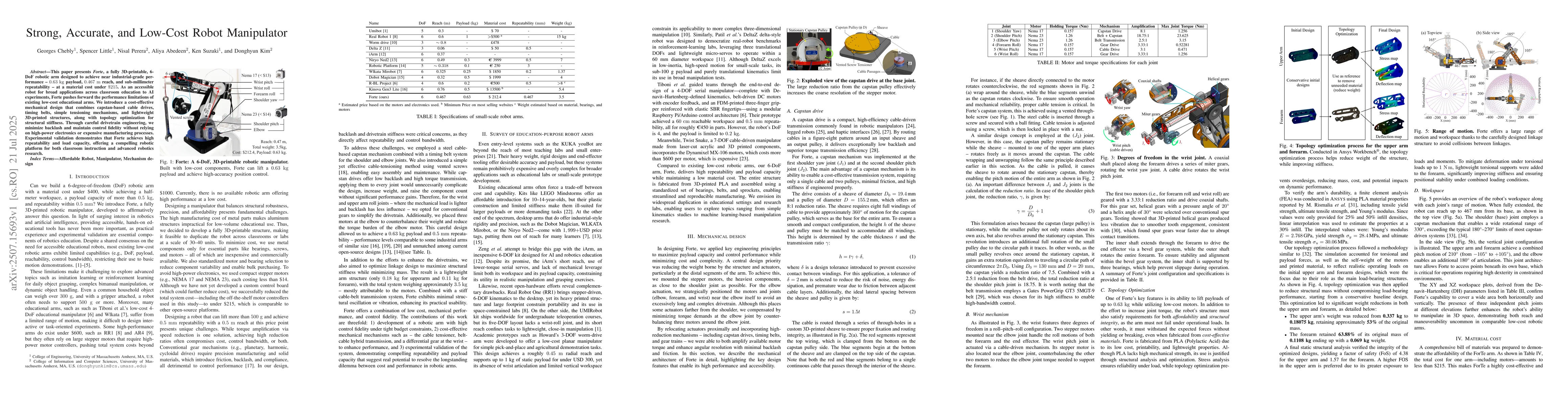 This paper presents Forte, a fully 3D-printable, 6-DoF robotic arm designed to achieve near industrial-grade performance - 0.63 kg payload, 0.467 m reach, and sub-millimeter repeatability - at a material cost under $215. As an accessible robot for broad applications across classroom education to AI experiments, Forte pushes forward the performance limitations of existing low-cost educational arms. We introduce a cost-effective mechanical design that combines capstan-based cable drives, timing belts, simple tensioning mechanisms, and lightweight 3D-printed structures, along with topology optimization for structural stiffness. Through careful drivetrain engineering, we minimize backlash and maintain control fidelity without relying on high-power electronics or expensive manufacturing processes. Experimental validation demonstrates that Forte achieves high repeatability and load capacity, offering a compelling robotic platform for both classroom instruction and advanced robotics research.