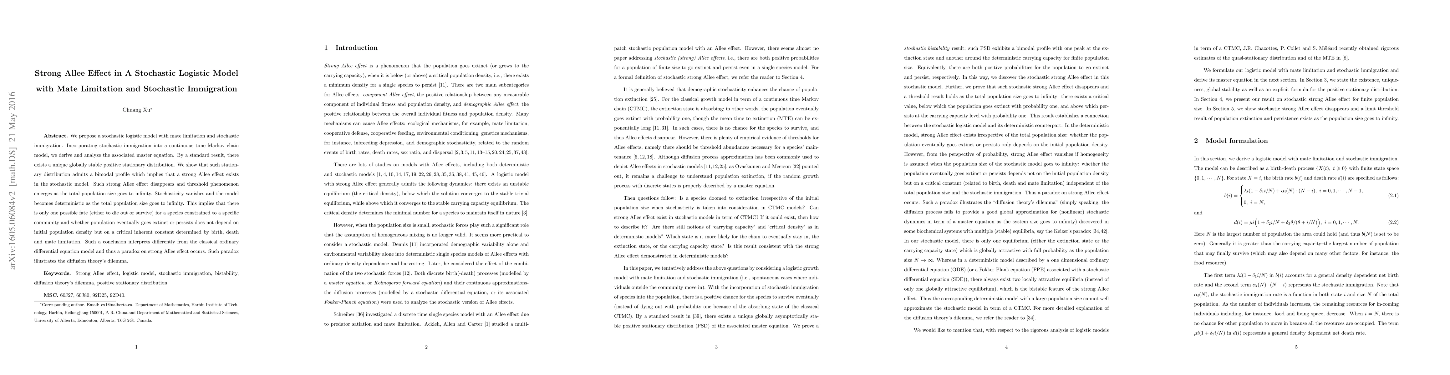 We propose a stochastic logistic model with mate limitation and stochastic immigration. Incorporating stochastic immigration into a continuous time Markov chain model, we derive and analyze the associated master equation. By a standard result, there exists a unique globally stable positive stationary distribution. We show that such stationary distribution admits a bimodal profile which implies that a strong Allee effect exists in the stochastic model. Such strong Allee effect disappears and threshold phenomenon emerges as the total population size goes to infinity. Stochasticity vanishes and the model becomes deterministic as the total population size goes to infinity. This implies that there is only one possible fate (either to die out or survive) for a species constrained to a specific community and whether population eventually goes extinct or persists does not depend on initial population density but on a critical inherent constant determined by birth, death and mate limitation. Such a conclusion interprets differently from the classical ordinary differential equation model and thus a paradox on strong Allee effect occurs. Such paradox illustrates the diffusion theory's dilemma.