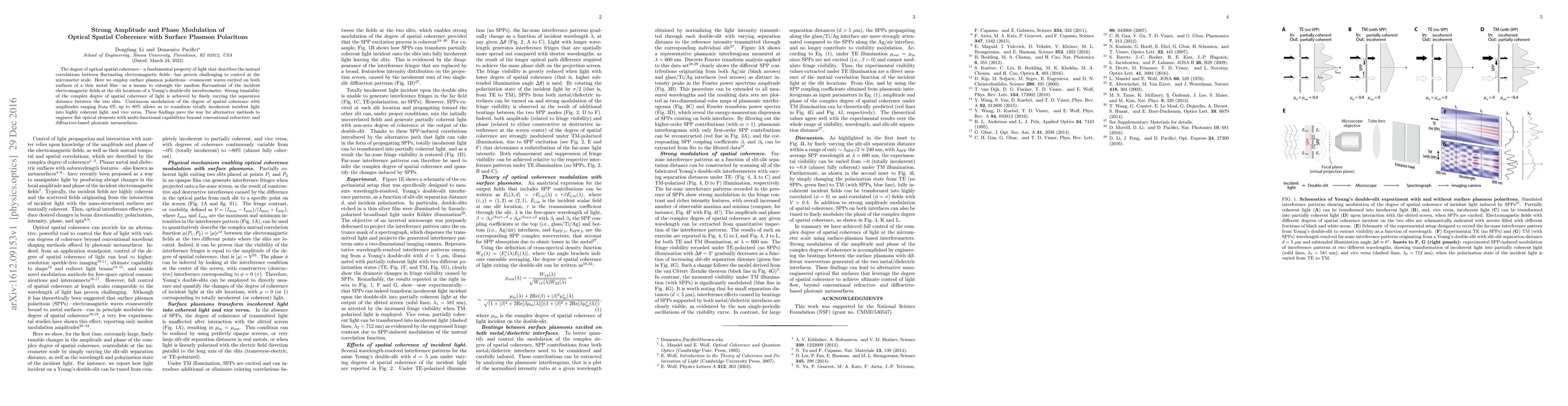 This paper demonstrates strong modulation of optical spatial coherence using surface plasmon polaritons, enabling transformation between incoherent and highly coherent light by adjusting the separation between slits in a double-slit interferometer. This approach offers a new method for engineering multifunctional optical elements beyond traditional metasurfaces.