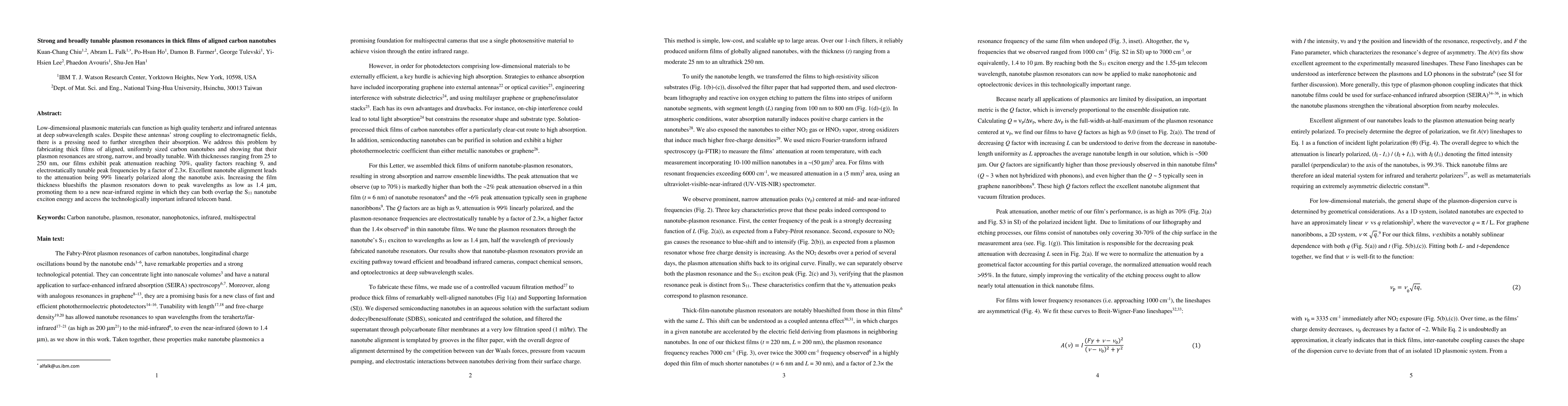 Low-dimensional plasmonic materials can function as high quality terahertz and infrared antennas at deep subwavelength scales. Despite these antennas' strong coupling to electromagnetic fields, there is a pressing need to further strengthen their absorption. We address this problem by fabricating thick films of aligned, uniformly sized carbon nanotubes and showing that their plasmon resonances are strong, narrow, and broadly tunable. With thicknesses ranging from 25 to 250 nm, our films exhibit peak attenuation reaching 70%, quality factors reaching 9, and electrostatically tunable peak frequencies by a factor of 2.3x. Excellent nanotube alignment leads to the attenuation being 99% linearly polarized along the nanotube axis. Increasing the film thickness blueshifts the plasmon resonators down to peak wavelengths as low as 1.4 micrometers, promoting them to a new near-infrared regime in which they can both overlap the S11 nanotube exciton energy and access the technologically important infrared telecom band.