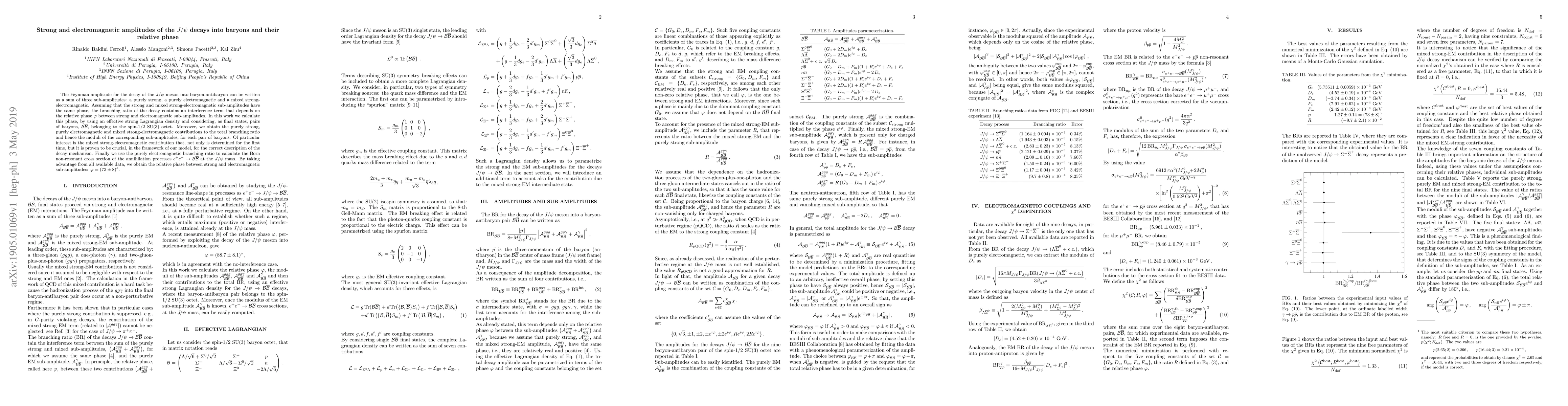 The Feynman amplitude for the decay of the $J/\psi$ meson into baryon-antibaryon can be written as a sum of three sub-amplitudes: a purely strong, a purely electromagnetic and a mixed strong-electromagnetic. Assuming that the strong and mixed strong-electromagnetic sub-amplitudes have the same phase, the branching ratio of the decay contains an interference term that depends on the relative phase $\varphi$ between strong and electromagnetic sub-amplitudes. In this work we calculate this phase, by using an effective strong Lagrangian density and considering, as final states, pairs of baryons, $\mathcal{B}\overline{\mathcal{B}}$, belonging to the spin-1/2 SU(3) octet. Moreover, we obtain the purely strong, purely electromagnetic and mixed strong-electromagnetic contributions to the total branching ratio and hence the moduli of the corresponding sub-amplitudes, for each pair of baryons. Of particular interest is the mixed strong-electromagnetic contribution that, not only is determined for the first time, but it is proven to be crucial, in the framework of our model, for the correct description of the decay mechanism. Finally we use the purely electromagnetic branching ratio to calculate the Born non-resonant cross section of the annihilation processes $e^+ e^- \to \mathcal{B}\overline{\mathcal{B}}$ at the $J/\psi$ mass. By taking advantage from all available data, we obtain the relative phase between strong and electromagnetic sub-amplitudes: $\varphi = (73\pm 8)^\circ$.